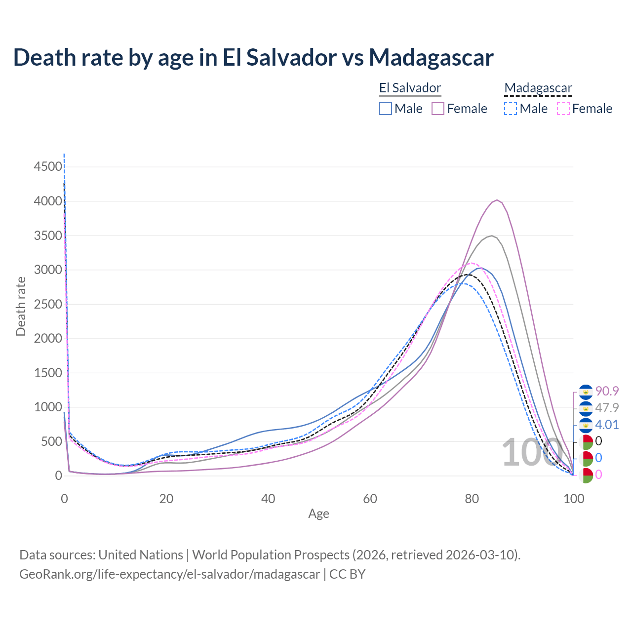 In El Salvador, the most common age of death is 84, compared to 0 in Madagascar. The median age of death is 78.1 in El Salvador and 72.2 in Madagascar, meaning only half of each cohort is expected to live past that age.