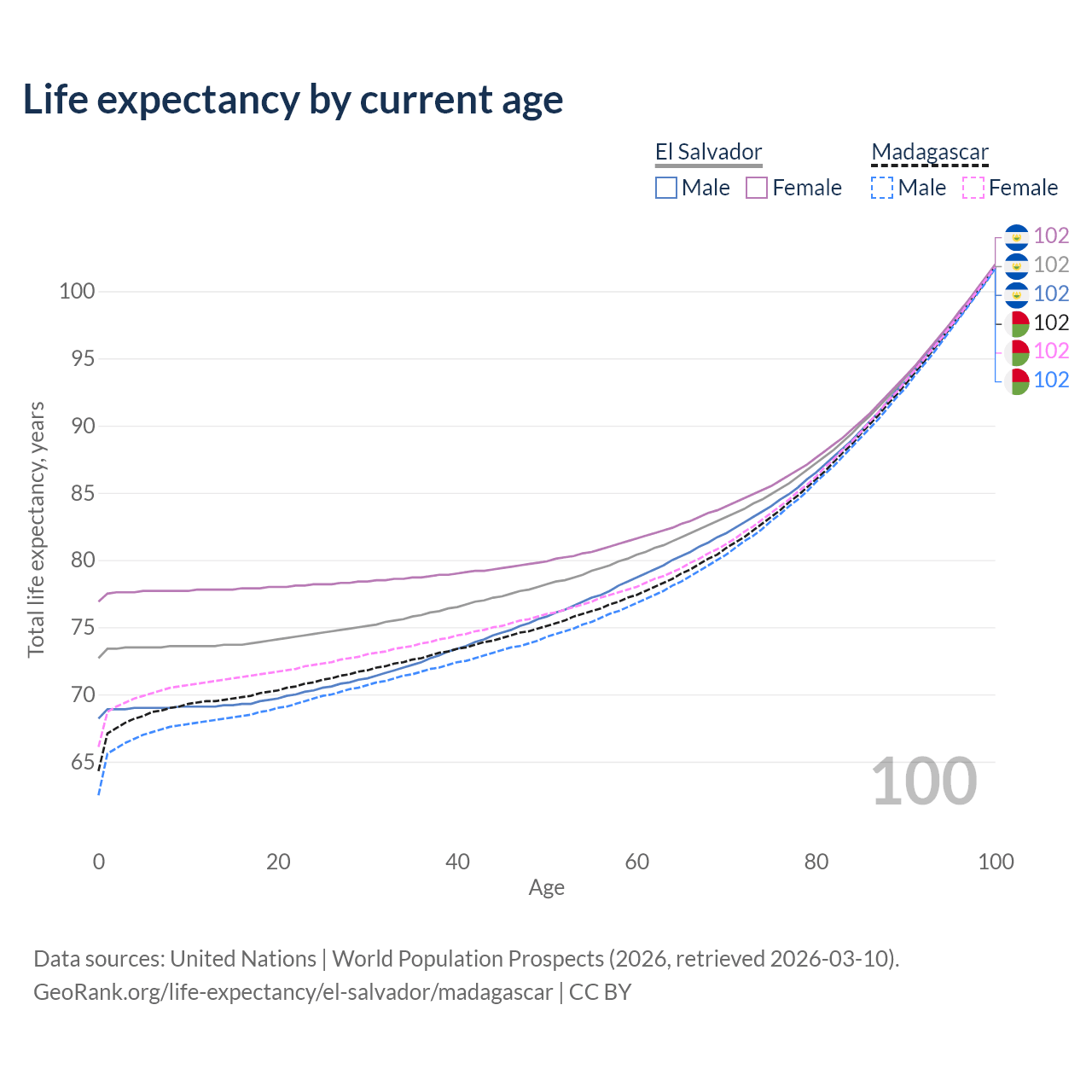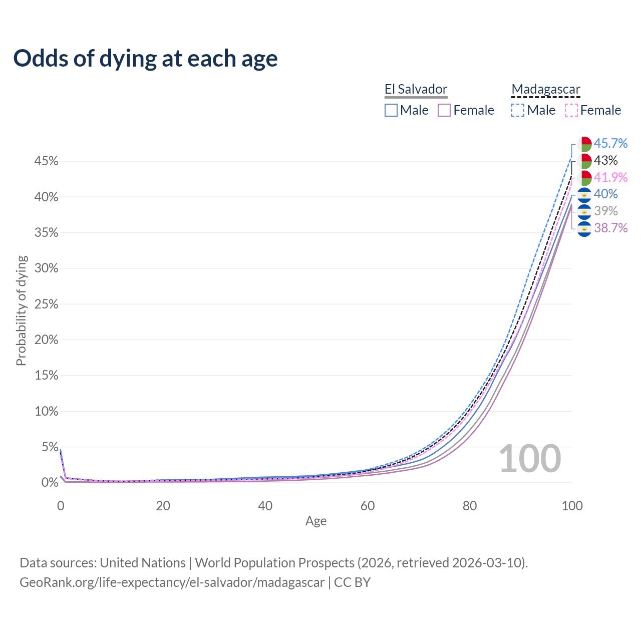 This life expectancy calculator shows the odds of living to 100, 95, 90, and below based on current age for both males and females in El Salvador and Madagascar, along with mean and median age of death. The calculations are based on the 2026 life tables (actuarial tables) from the UN World Population Prospects.