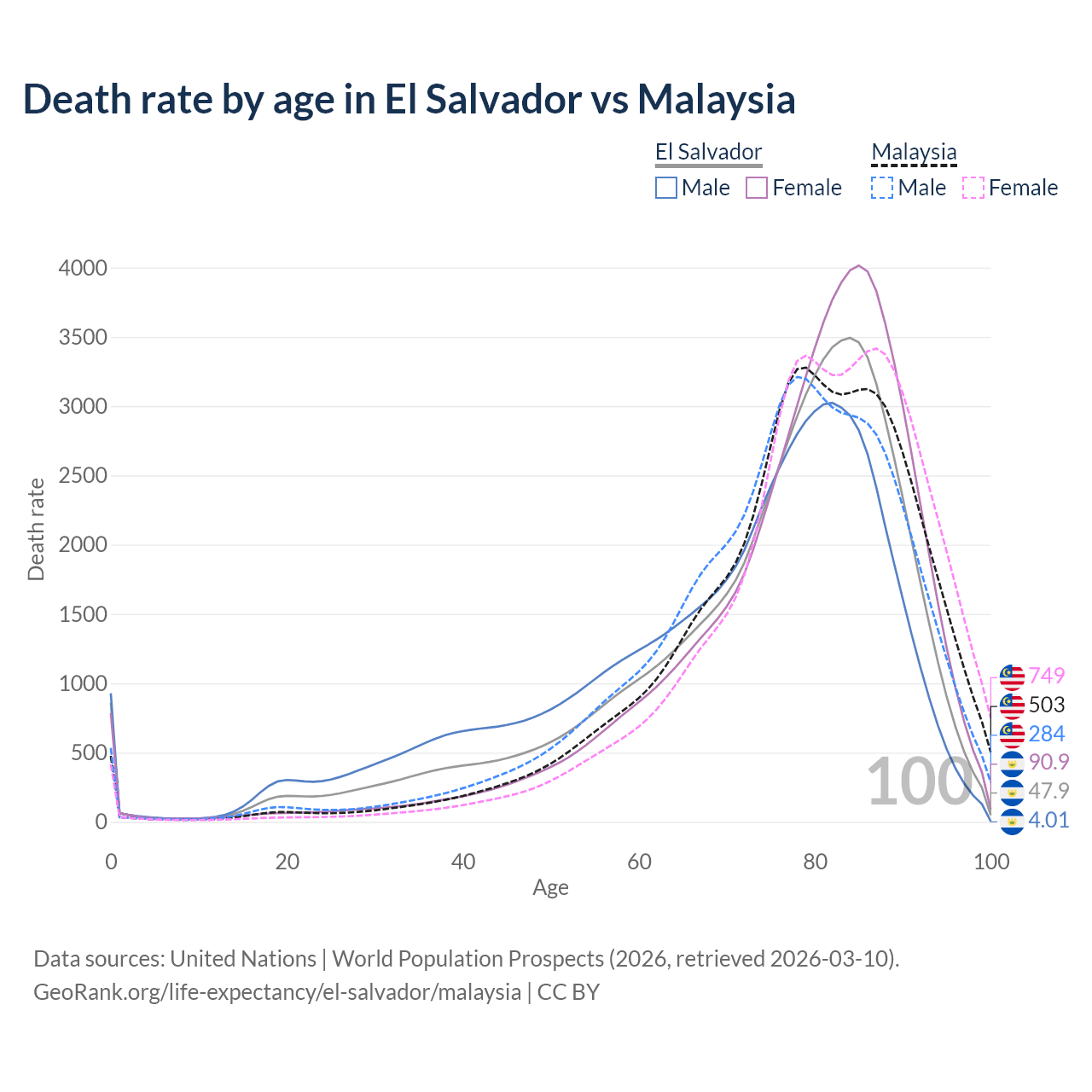 In El Salvador, the most common age of death is 84, compared to 79 in Malaysia. The median age of death is 78.1 in El Salvador and 79.8 in Malaysia, meaning only half of each cohort is expected to live past that age.