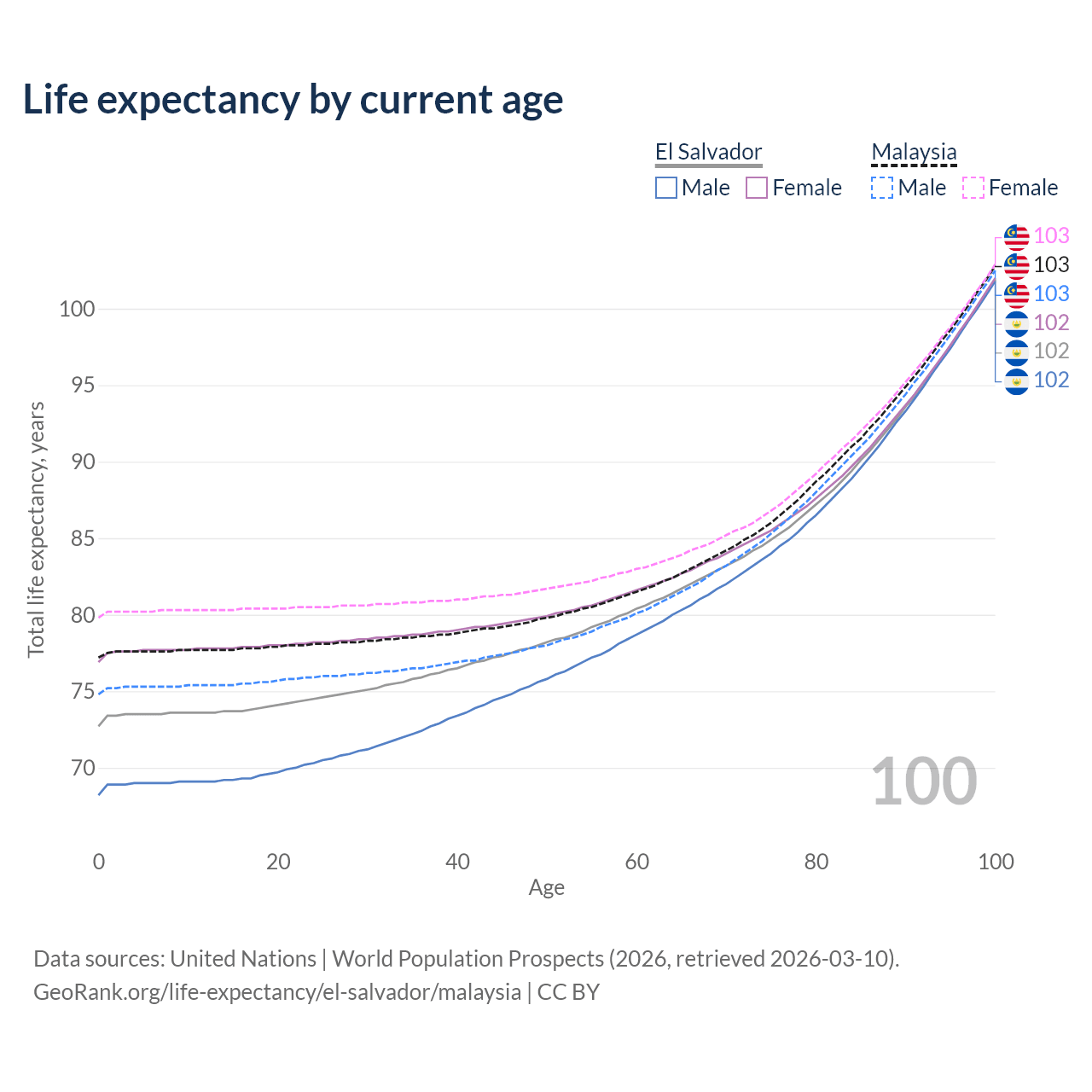 This life expectancy calculator shows the odds of living to 100, 95, 90, and below based on current age for both males and females in El Salvador and Malaysia, along with mean and median age of death. The calculations are based on the 2026 life tables (actuarial tables) from the UN World Population Prospects.