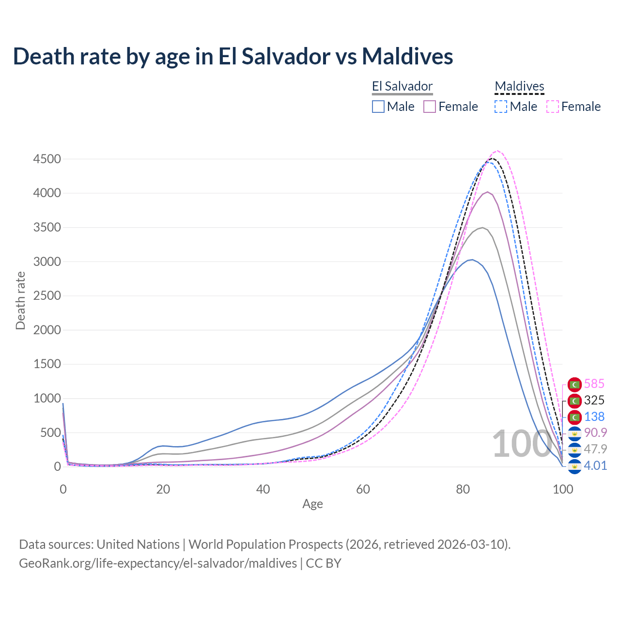 In El Salvador, the most common age of death is 84, compared to 86 in Maldives. The median age of death is 78.1 in El Salvador and 83.8 in Maldives, meaning only half of each cohort is expected to live past that age.
