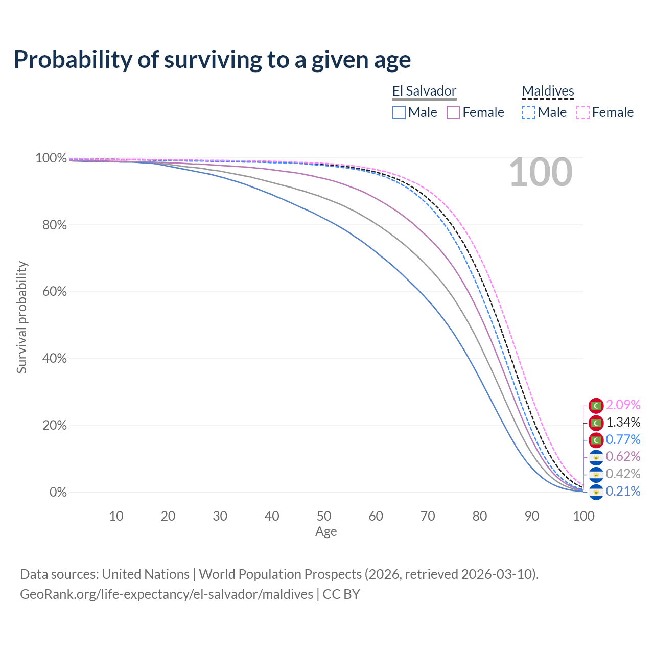 This life expectancy calculator shows the odds of living to 100, 95, 90, and below based on current age for both males and females in El Salvador and Maldives, along with mean and median age of death. The calculations are based on the 2026 life tables (actuarial tables) from the UN World Population Prospects.