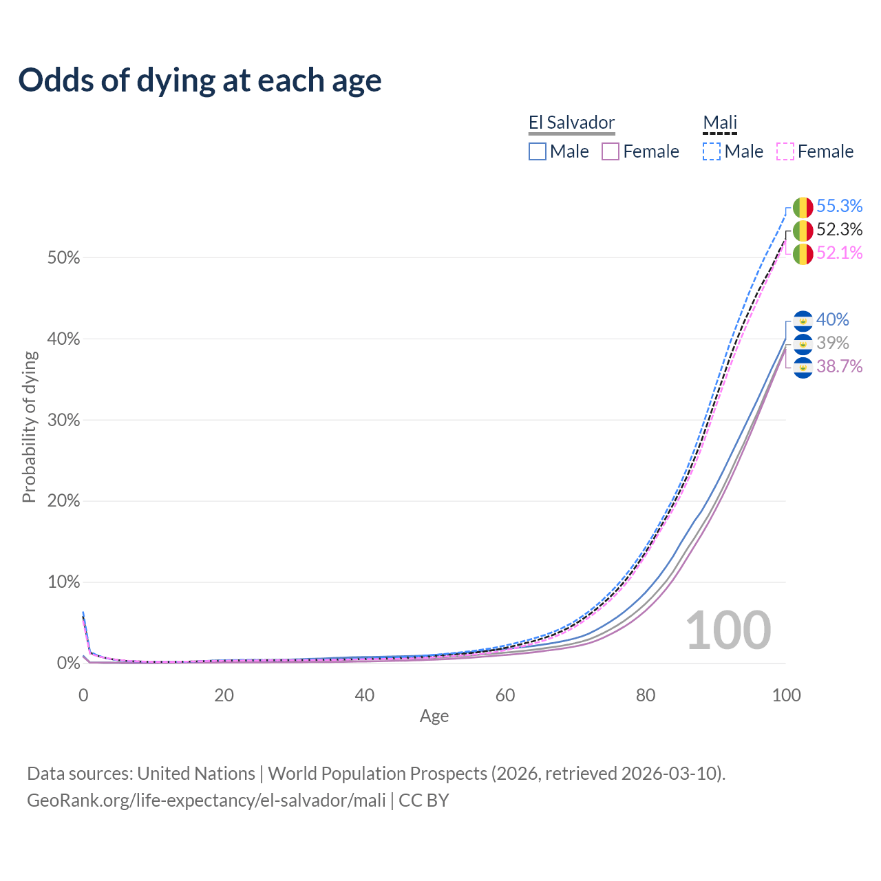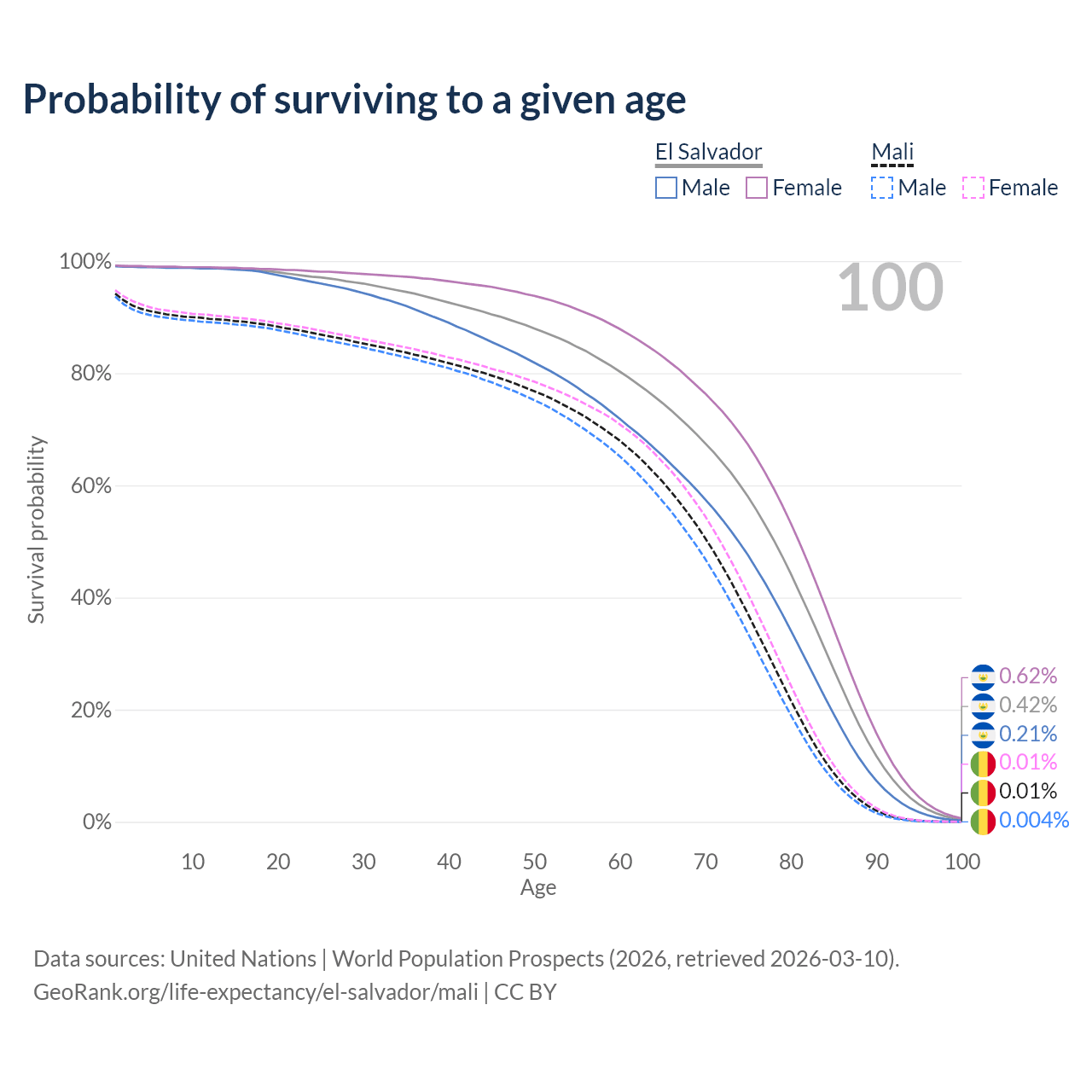 This life expectancy calculator shows the odds of living to 100, 95, 90, and below based on current age for both males and females in El Salvador and Mali, along with mean and median age of death. The calculations are based on the 2026 life tables (actuarial tables) from the UN World Population Prospects.