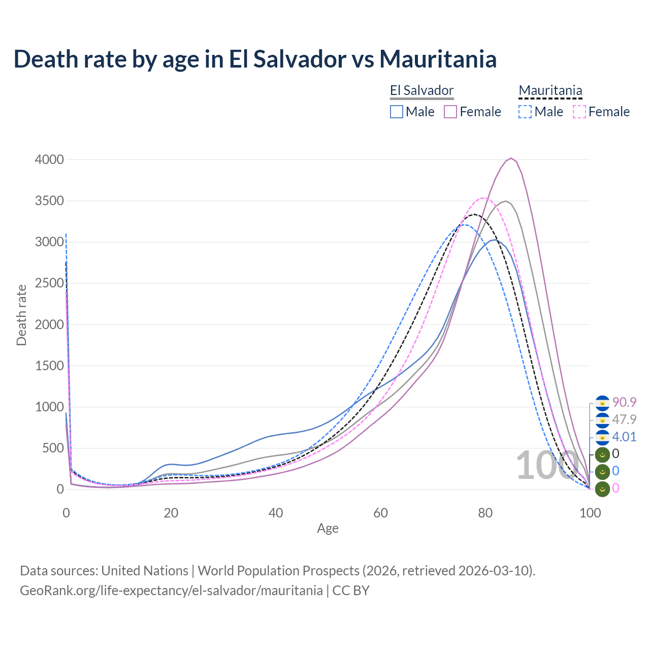 In El Salvador, the most common age of death is 84, compared to 78 in Mauritania. The median age of death is 78.1 in El Salvador and 74.1 in Mauritania, meaning only half of each cohort is expected to live past that age.
