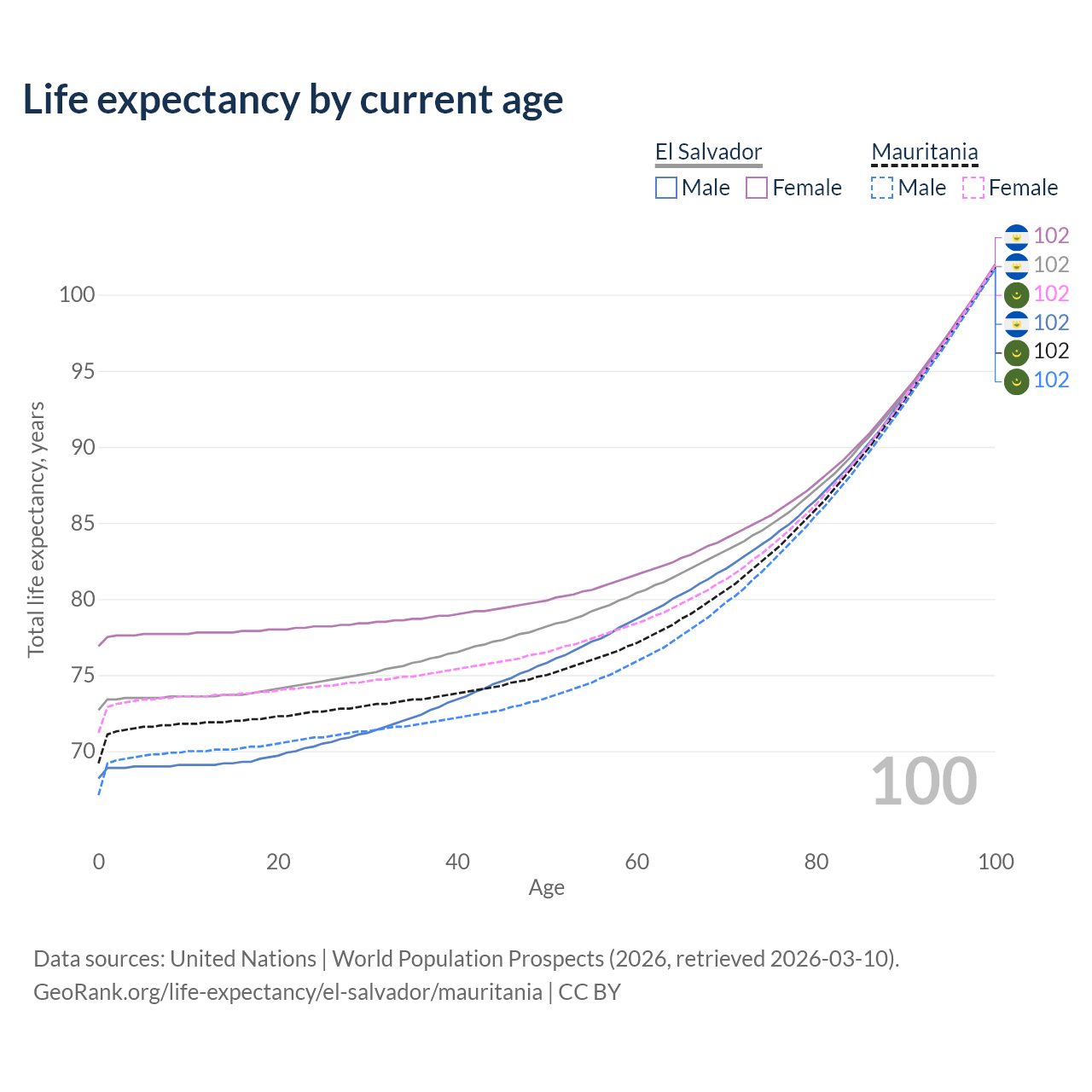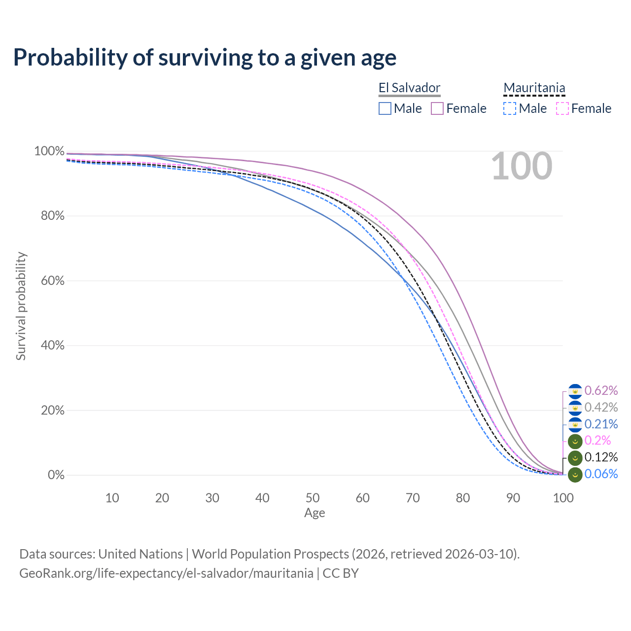This life expectancy calculator shows the odds of living to 100, 95, 90, and below based on current age for both males and females in El Salvador and Mauritania, along with mean and median age of death. The calculations are based on the 2026 life tables (actuarial tables) from the UN World Population Prospects.