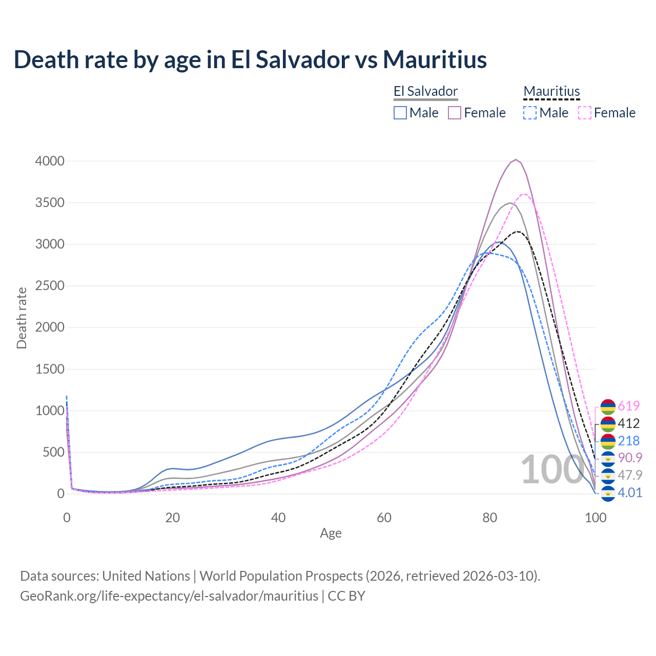 In El Salvador, the most common age of death is 84, compared to 85 in Mauritius. The median age of death is 78.1 in El Salvador and 79.1 in Mauritius, meaning only half of each cohort is expected to live past that age.