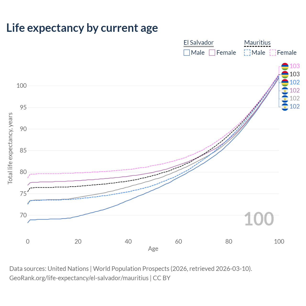 This life expectancy calculator shows the odds of living to 100, 95, 90, and below based on current age for both males and females in El Salvador and Mauritius, along with mean and median age of death. The calculations are based on the 2026 life tables (actuarial tables) from the UN World Population Prospects.