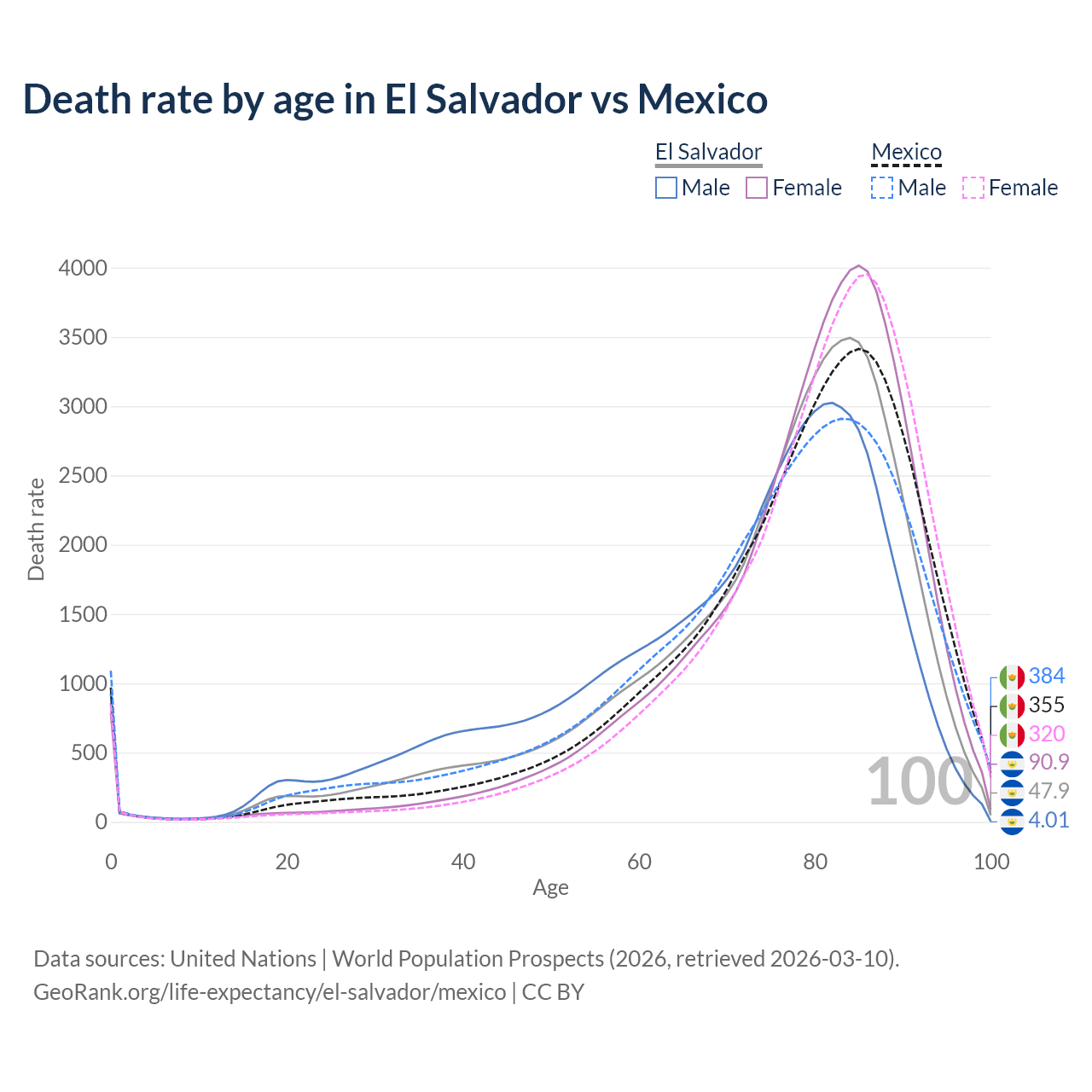 In El Salvador, the most common age of death is 84, compared to 85 in Mexico. The median age of death is 78.1 in El Salvador and 80.1 in Mexico, meaning only half of each cohort is expected to live past that age.