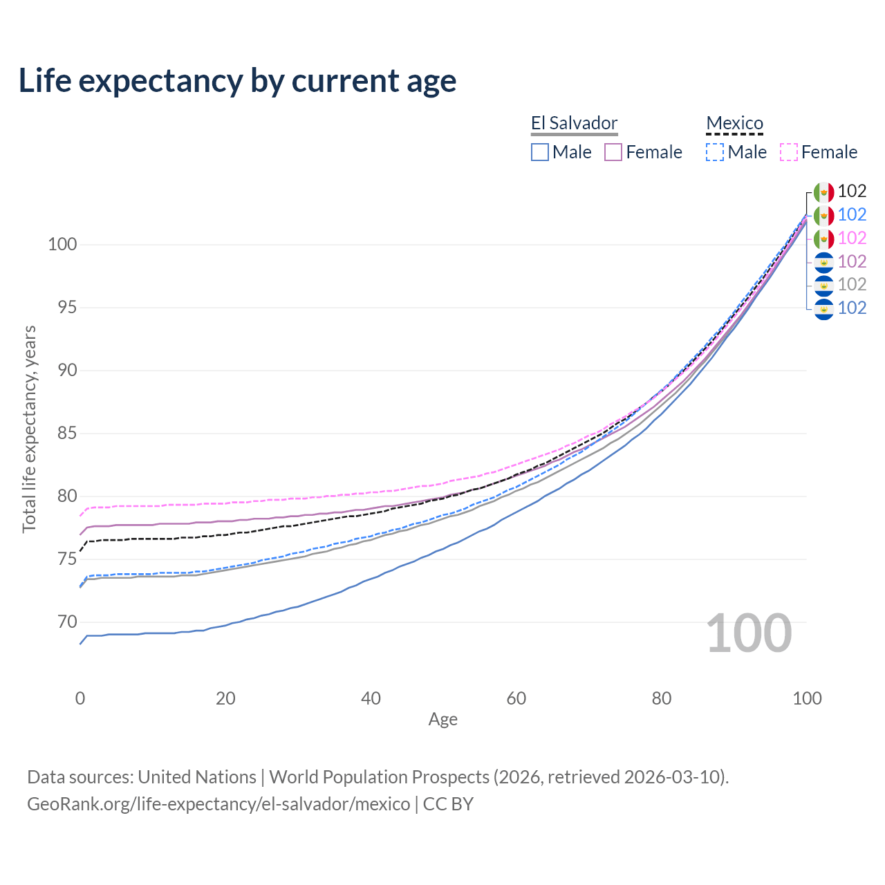 This life expectancy calculator shows the odds of living to 100, 95, 90, and below based on current age for both males and females in El Salvador and Mexico, along with mean and median age of death. The calculations are based on the 2026 life tables (actuarial tables) from the UN World Population Prospects.