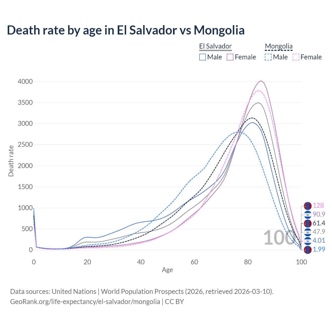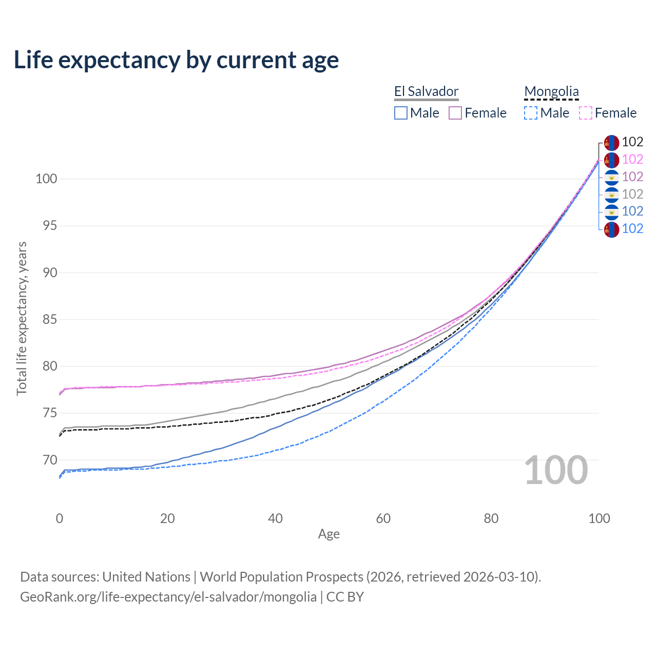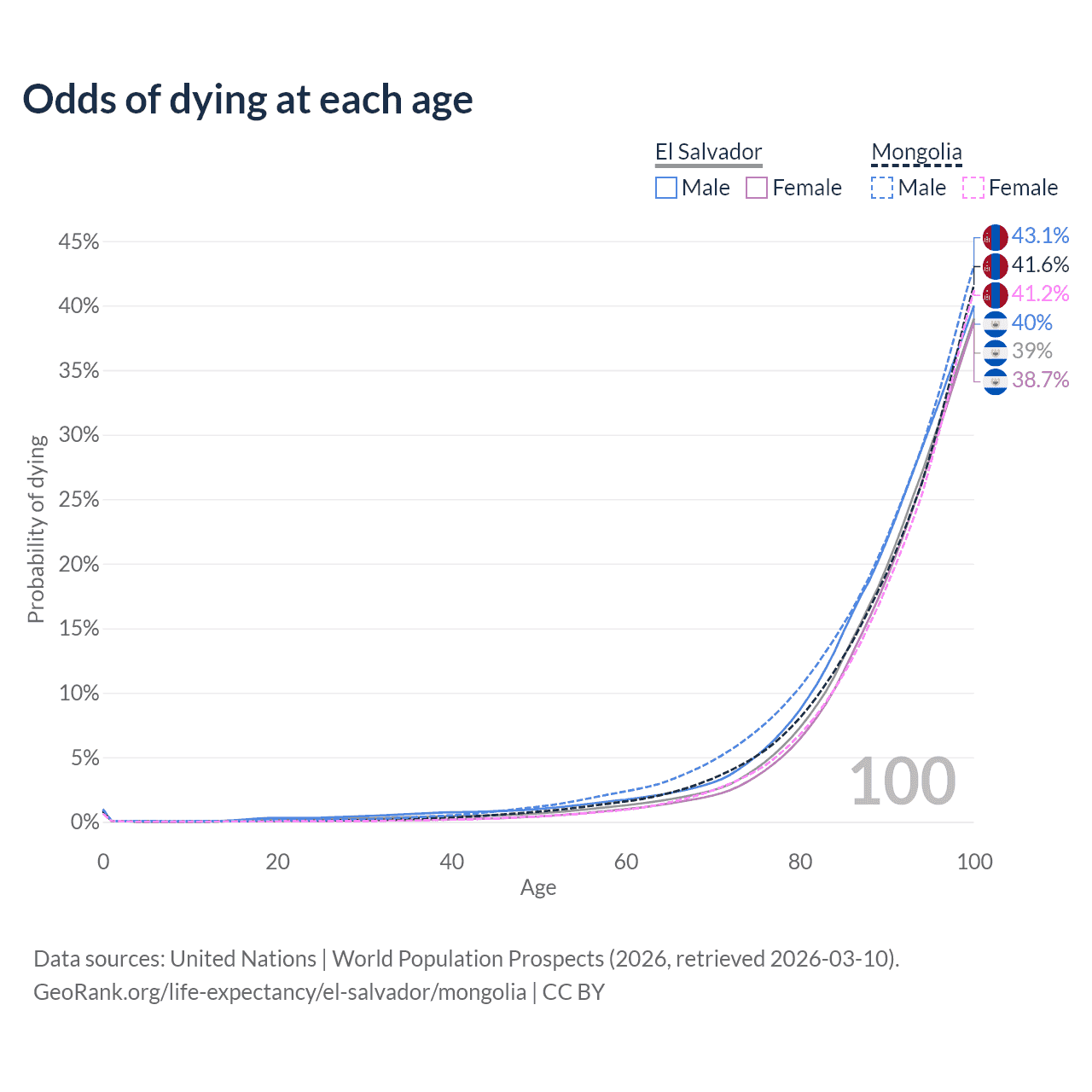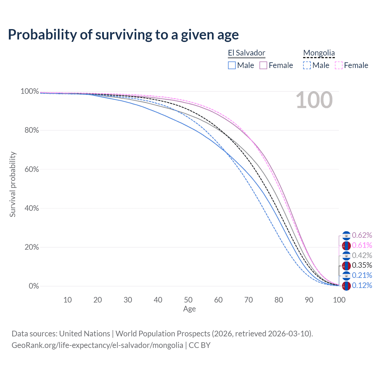 This life expectancy calculator shows the odds of living to 100, 95, 90, and below based on current age for both males and females in El Salvador and Mongolia, along with mean and median age of death. The calculations are based on the 2026 life tables (actuarial tables) from the UN World Population Prospects.