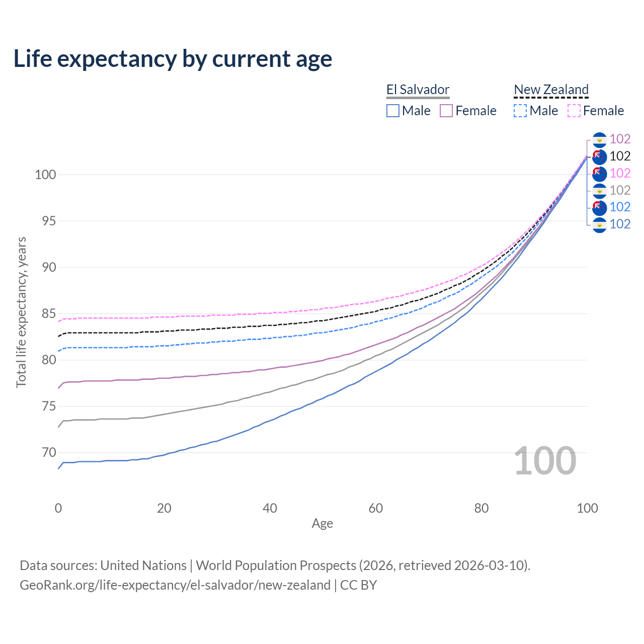 This life expectancy calculator shows the odds of living to 100, 95, 90, and below based on current age for both males and females in El Salvador and New Zealand, along with mean and median age of death. The calculations are based on the 2026 life tables (actuarial tables) from the UN World Population Prospects.