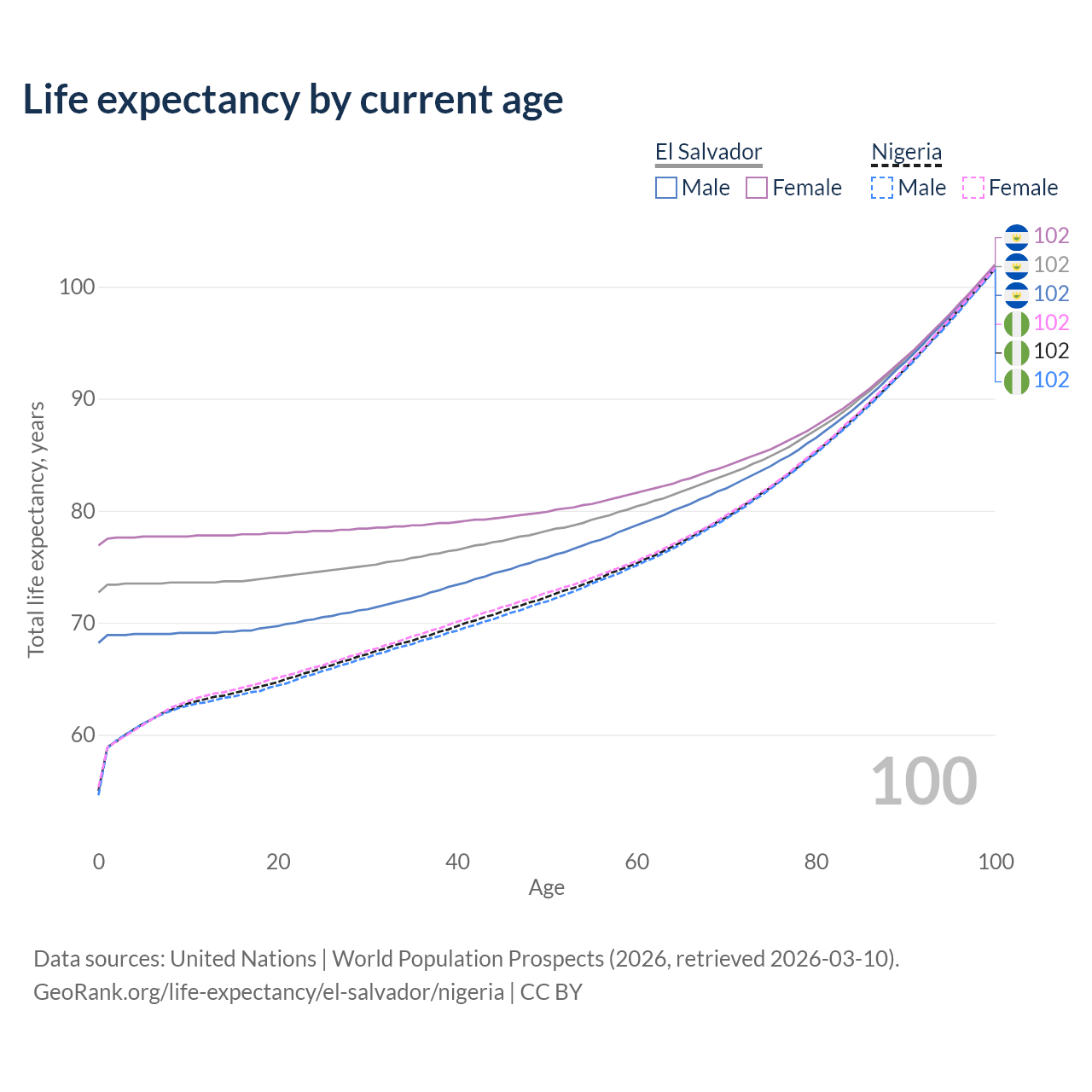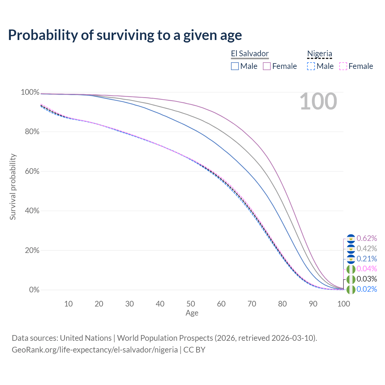 This life expectancy calculator shows the odds of living to 100, 95, 90, and below based on current age for both males and females in El Salvador and Nigeria, along with mean and median age of death. The calculations are based on the 2026 life tables (actuarial tables) from the UN World Population Prospects.