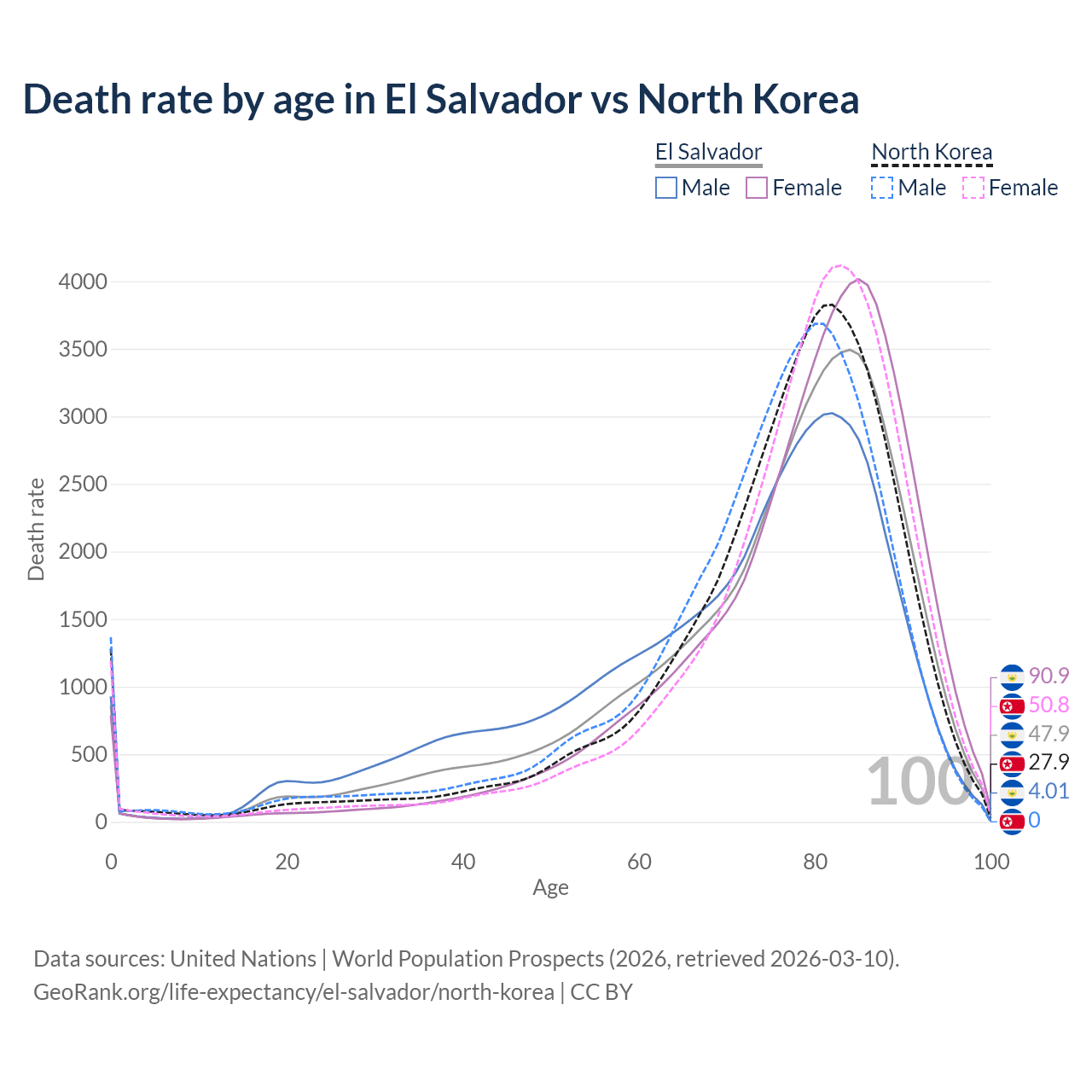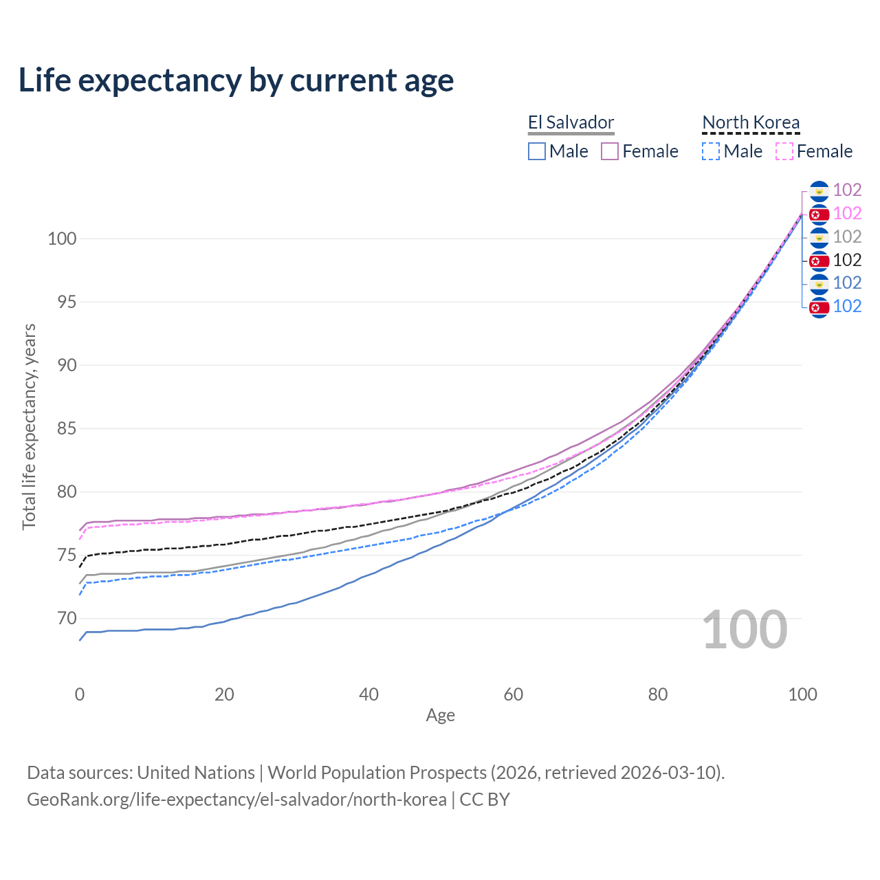 This life expectancy calculator shows the odds of living to 100, 95, 90, and below based on current age for both males and females in El Salvador and North Korea, along with mean and median age of death. The calculations are based on the 2026 life tables (actuarial tables) from the UN World Population Prospects.