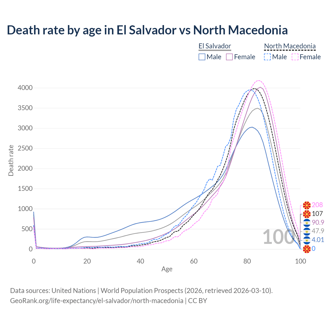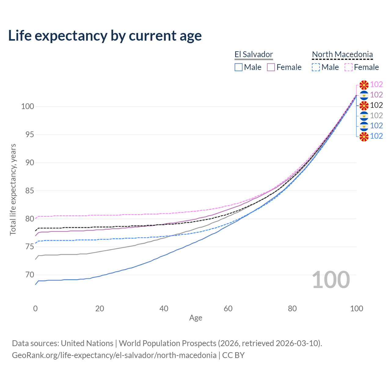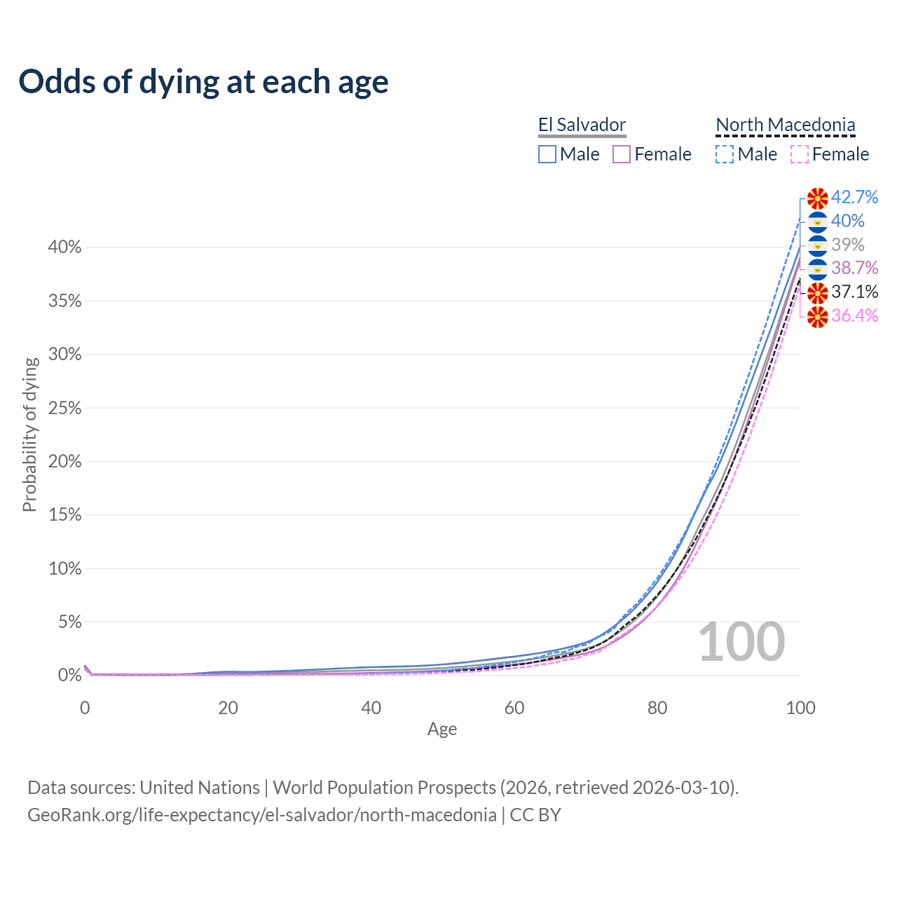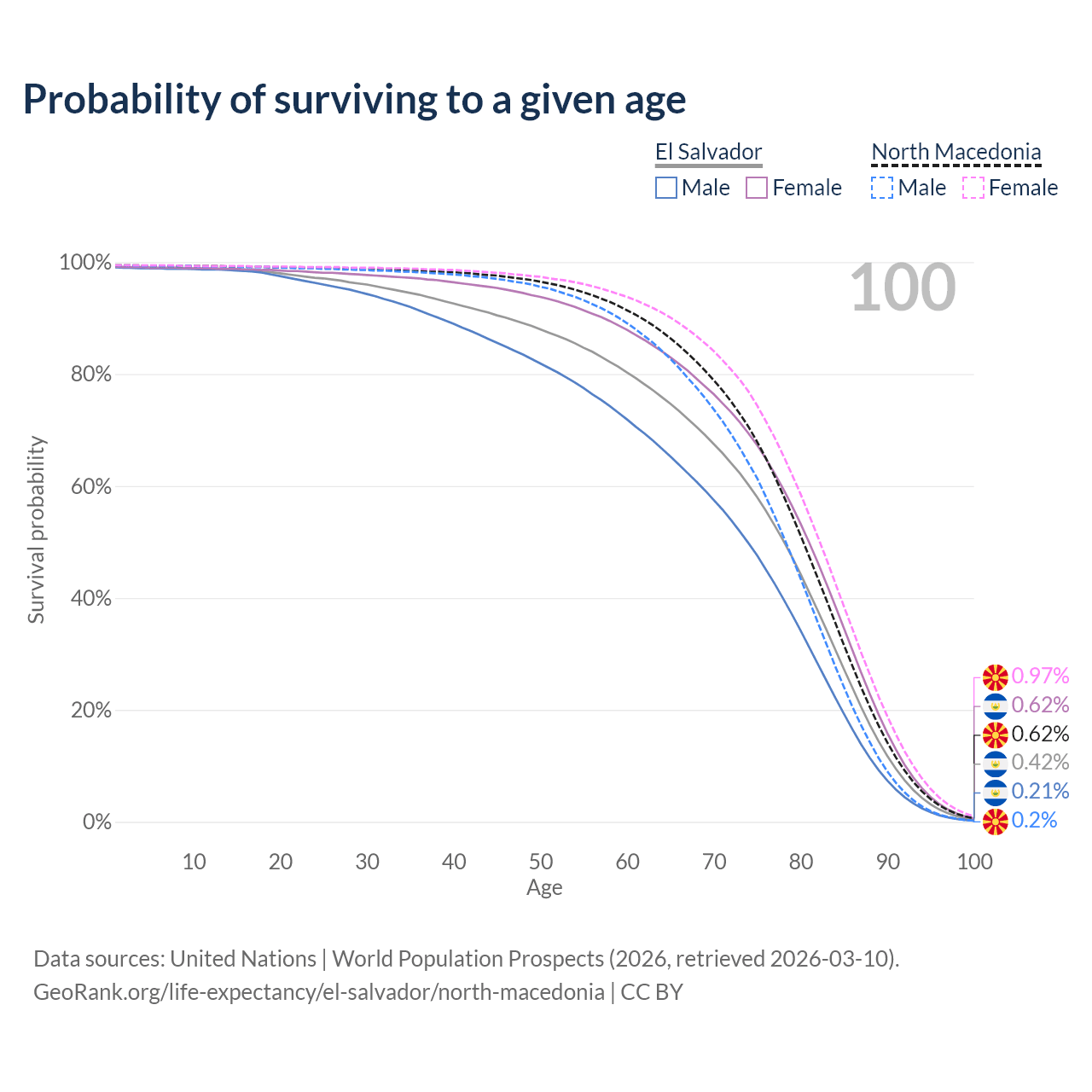 This life expectancy calculator shows the odds of living to 100, 95, 90, and below based on current age for both males and females in El Salvador and North Macedonia, along with mean and median age of death. The calculations are based on the 2026 life tables (actuarial tables) from the UN World Population Prospects.