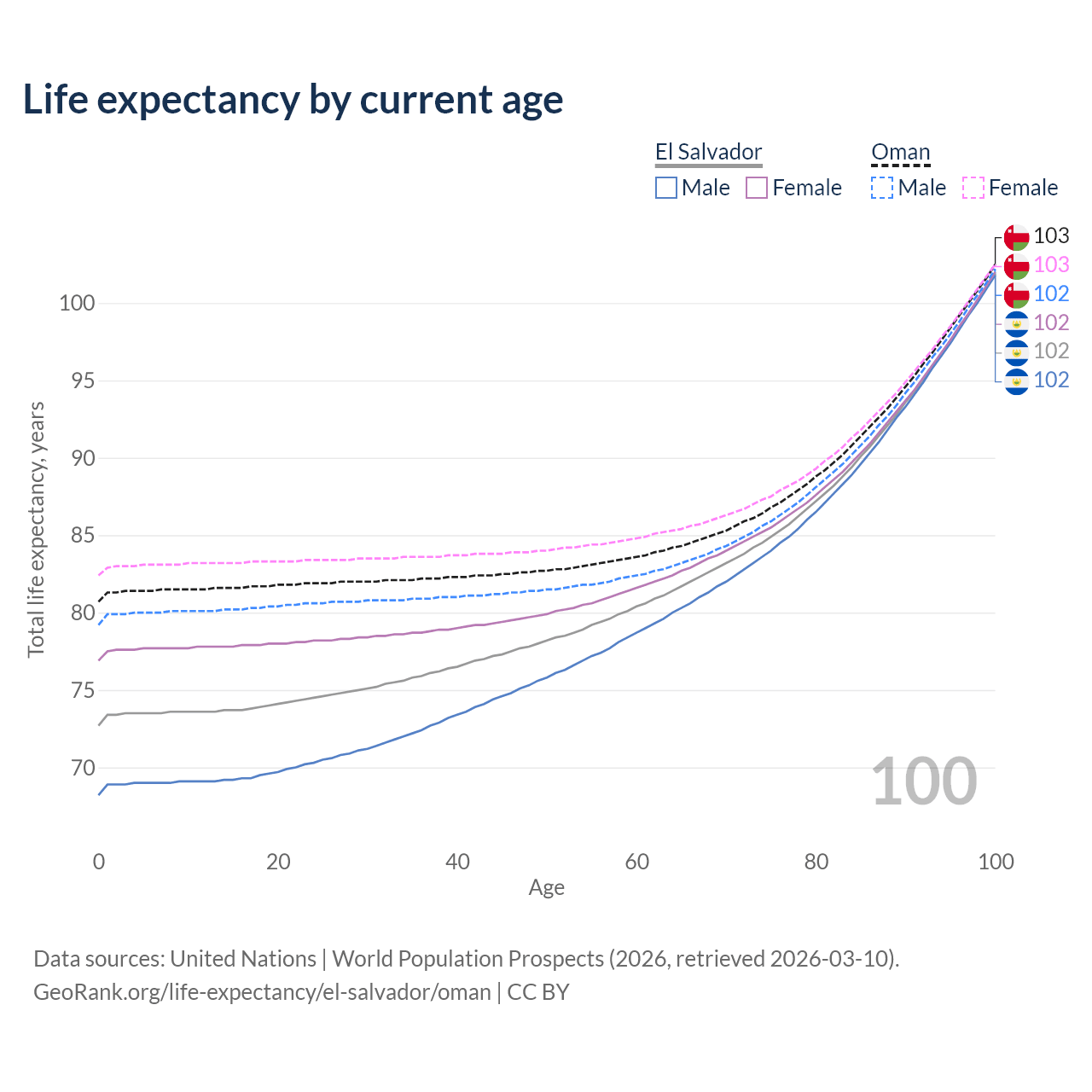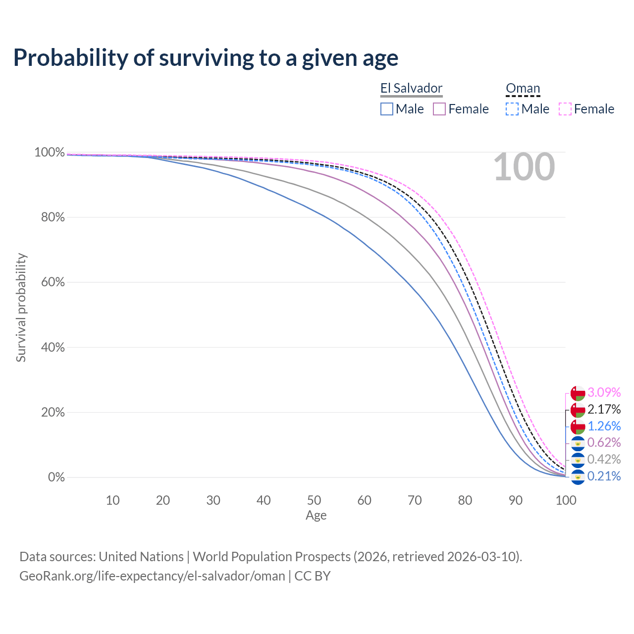 This life expectancy calculator shows the odds of living to 100, 95, 90, and below based on current age for both males and females in El Salvador and Oman, along with mean and median age of death. The calculations are based on the 2026 life tables (actuarial tables) from the UN World Population Prospects.