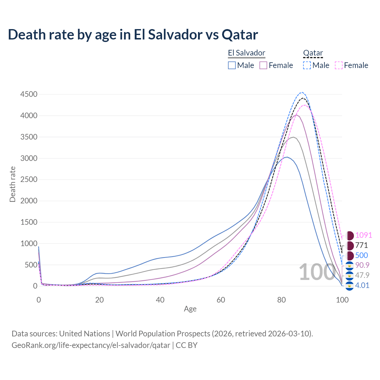 In El Salvador, the most common age of death is 84, compared to 87 in Qatar. The median age of death is 78.1 in El Salvador and 85.1 in Qatar, meaning only half of each cohort is expected to live past that age.