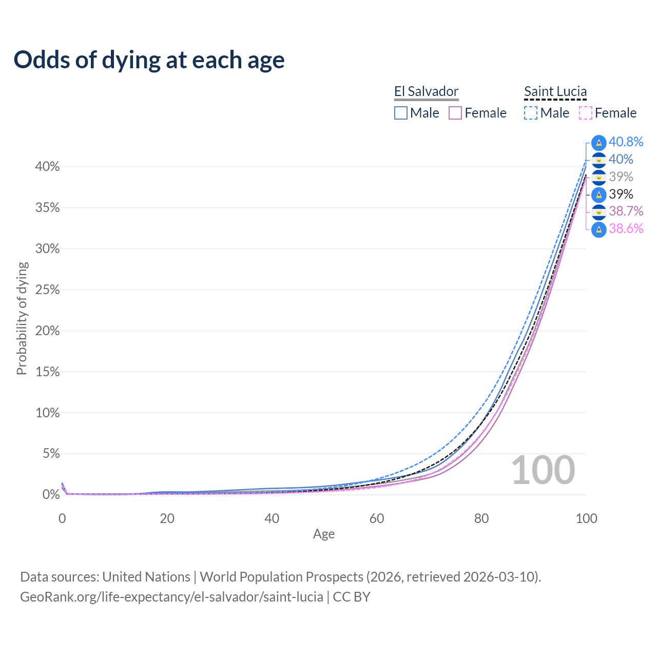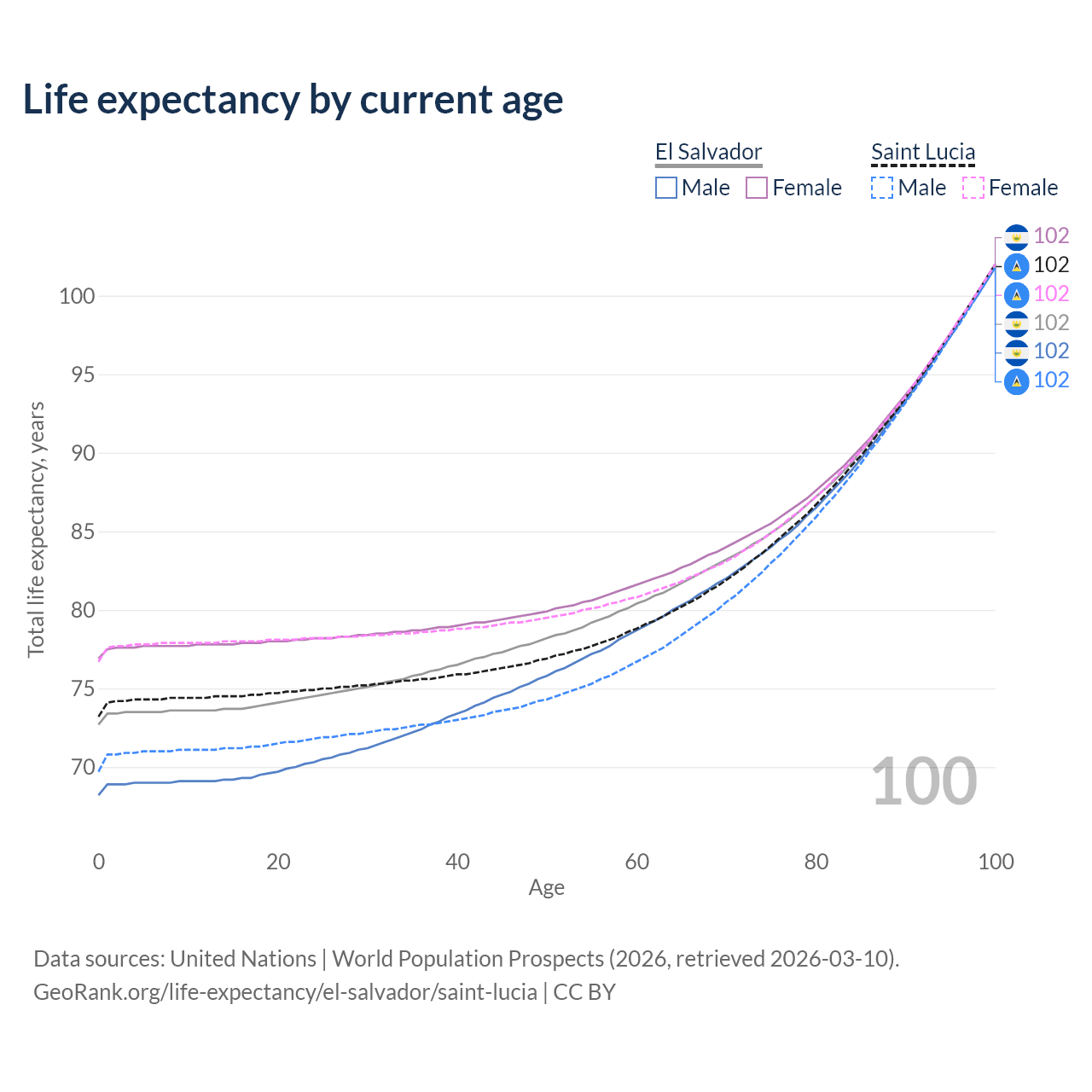 This life expectancy calculator shows the odds of living to 100, 95, 90, and below based on current age for both males and females in El Salvador and Saint Lucia, along with mean and median age of death. The calculations are based on the 2026 life tables (actuarial tables) from the UN World Population Prospects.