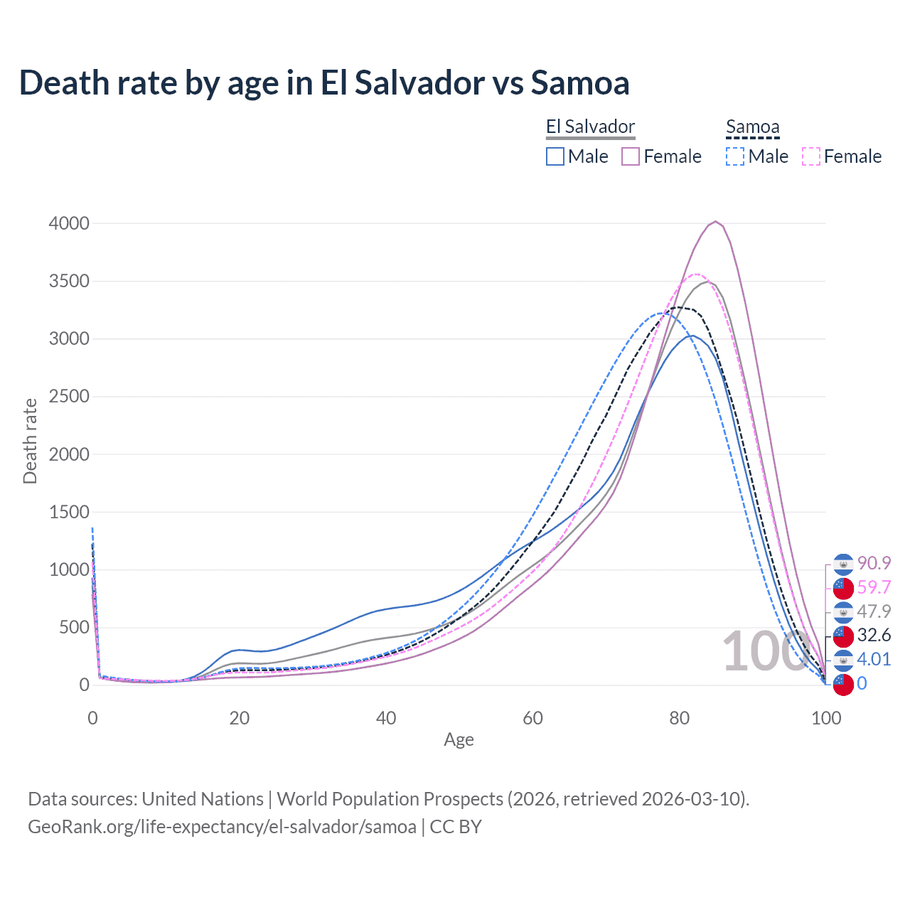 In El Salvador, the most common age of death is 84, compared to 80 in Samoa. The median age of death is 78.1 in El Salvador and 75.9 in Samoa, meaning only half of each cohort is expected to live past that age.
