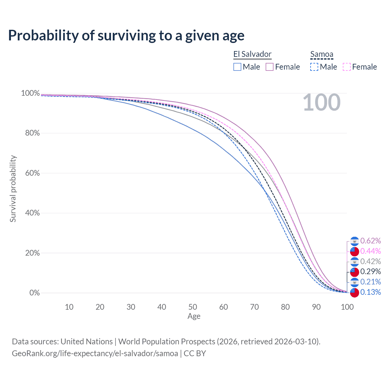 This life expectancy calculator shows the odds of living to 100, 95, 90, and below based on current age for both males and females in El Salvador and Samoa, along with mean and median age of death. The calculations are based on the 2026 life tables (actuarial tables) from the UN World Population Prospects.