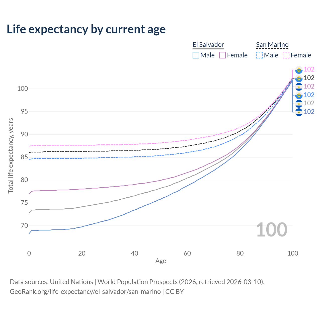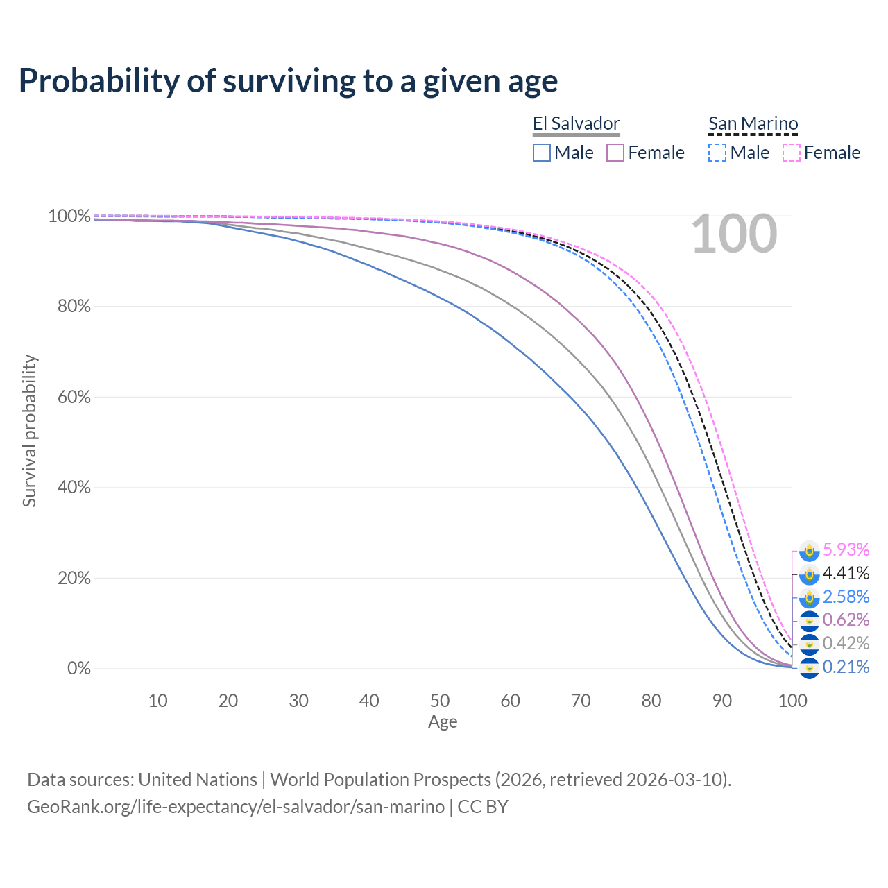 This life expectancy calculator shows the odds of living to 100, 95, 90, and below based on current age for both males and females in El Salvador and San Marino, along with mean and median age of death. The calculations are based on the 2026 life tables (actuarial tables) from the UN World Population Prospects.