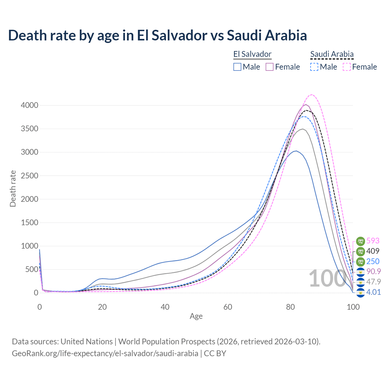 In El Salvador, the most common age of death is 84, compared to 85 in Saudi Arabia. The median age of death is 78.1 in El Salvador and 82.5 in Saudi Arabia, meaning only half of each cohort is expected to live past that age.
