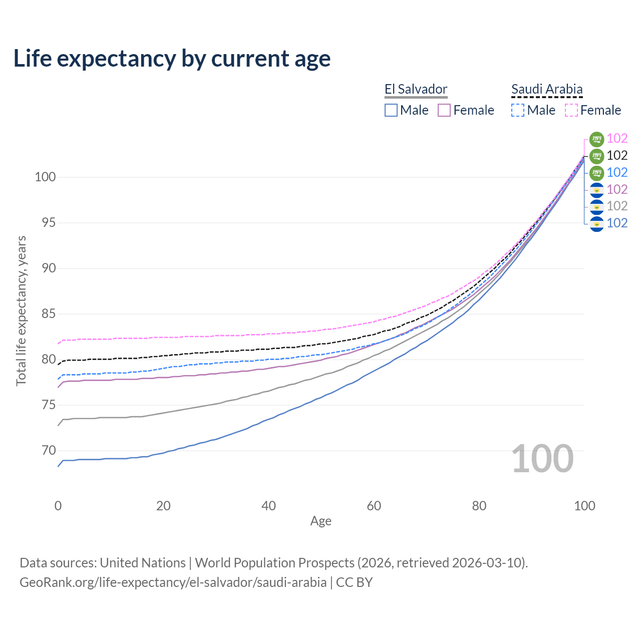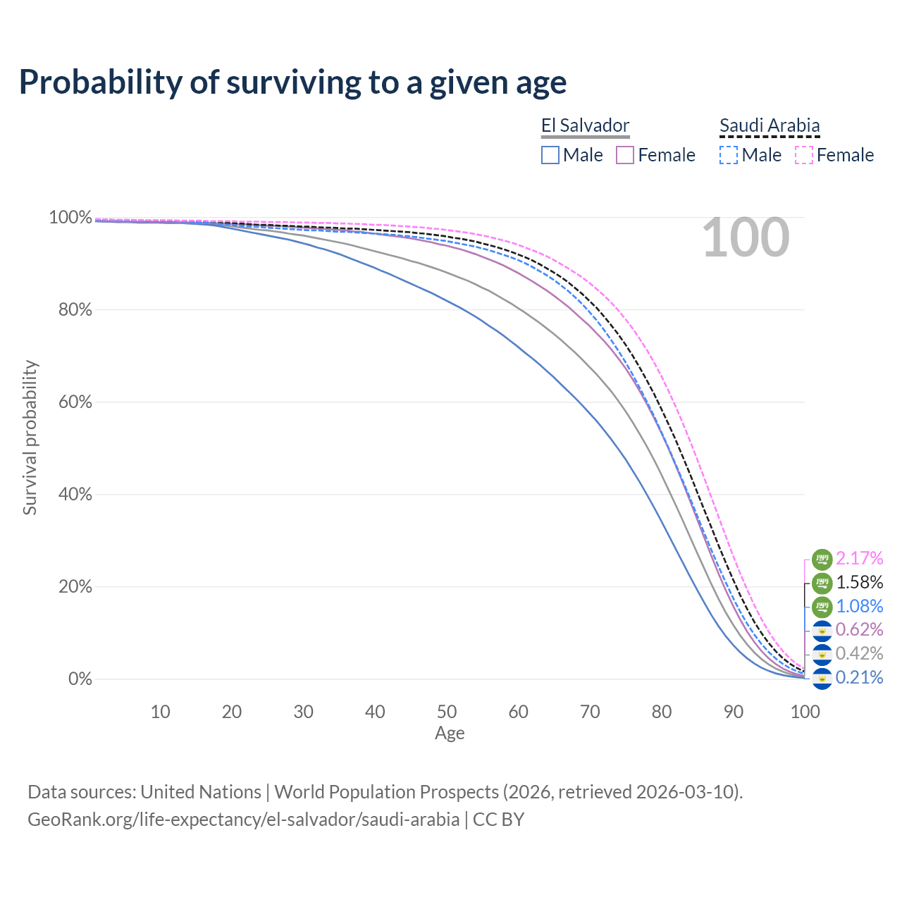 This life expectancy calculator shows the odds of living to 100, 95, 90, and below based on current age for both males and females in El Salvador and Saudi Arabia, along with mean and median age of death. The calculations are based on the 2026 life tables (actuarial tables) from the UN World Population Prospects.