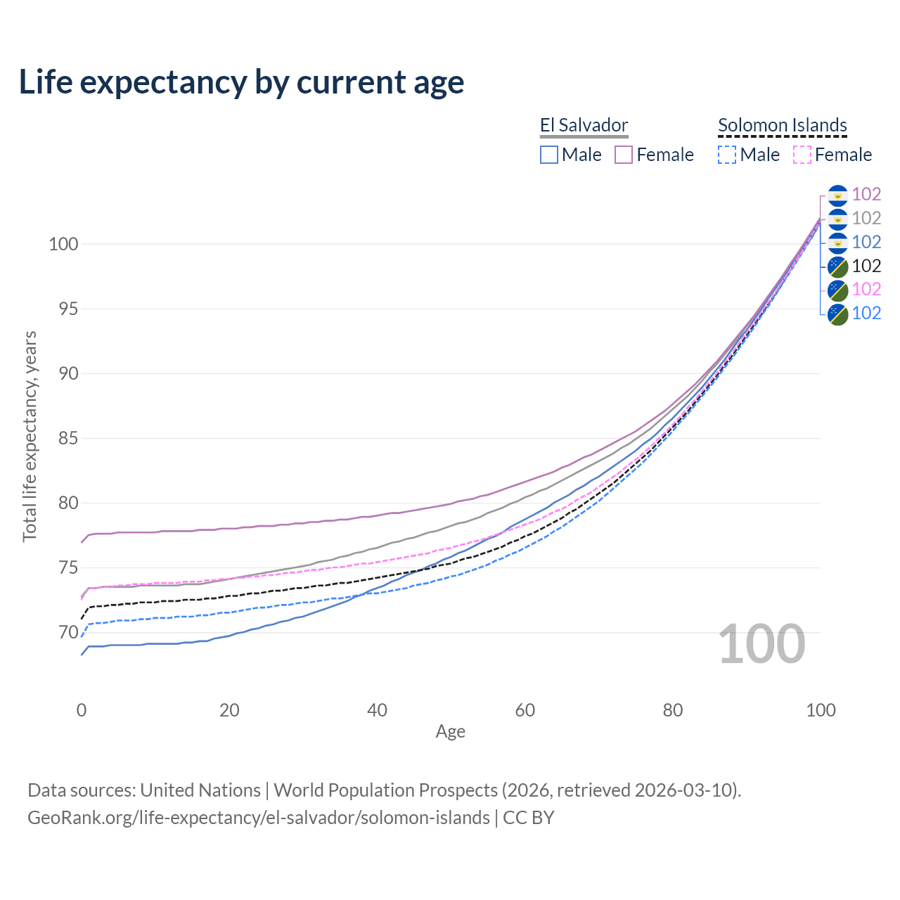 This life expectancy calculator shows the odds of living to 100, 95, 90, and below based on current age for both males and females in El Salvador and the Solomon Islands, along with mean and median age of death. The calculations are based on the 2026 life tables (actuarial tables) from the UN World Population Prospects.