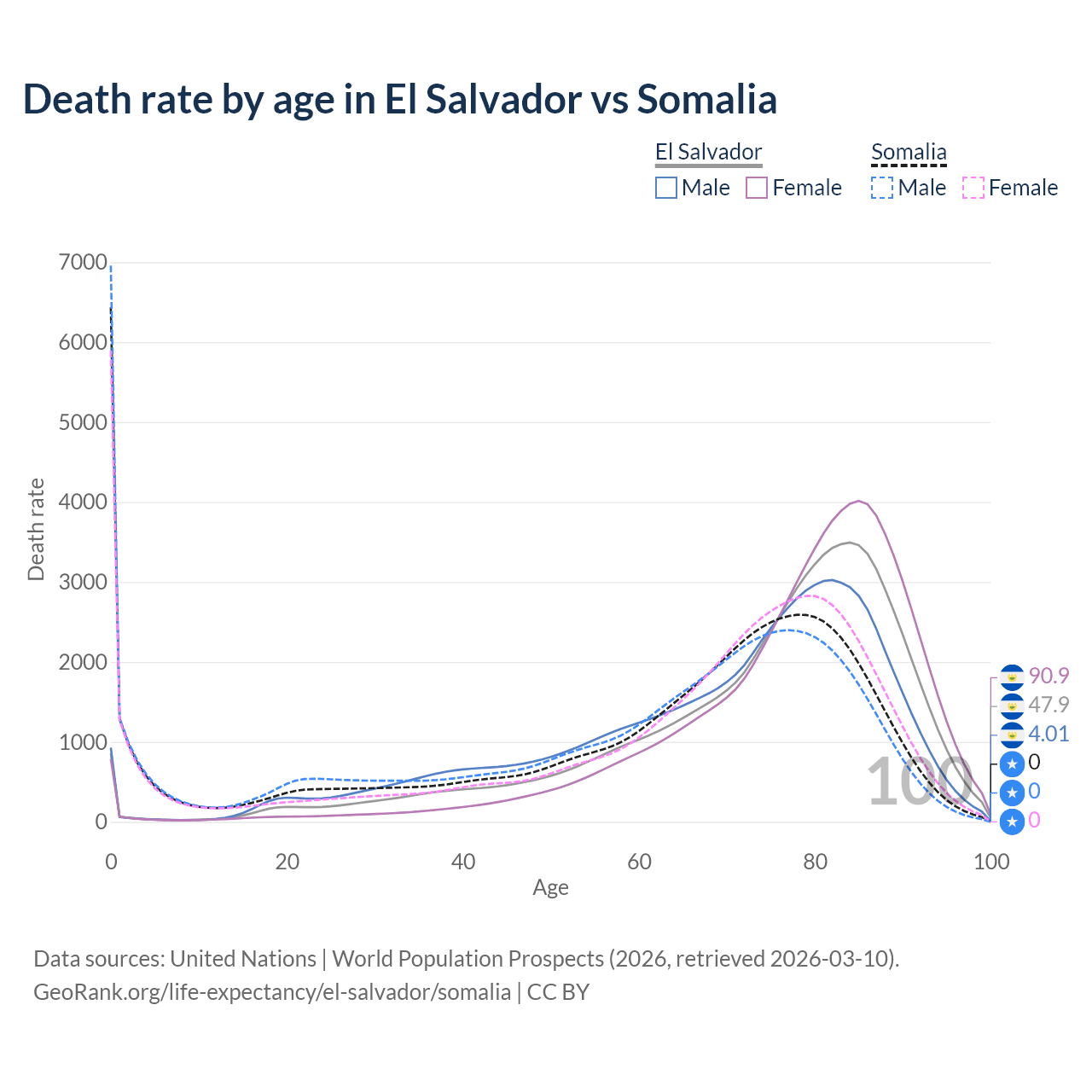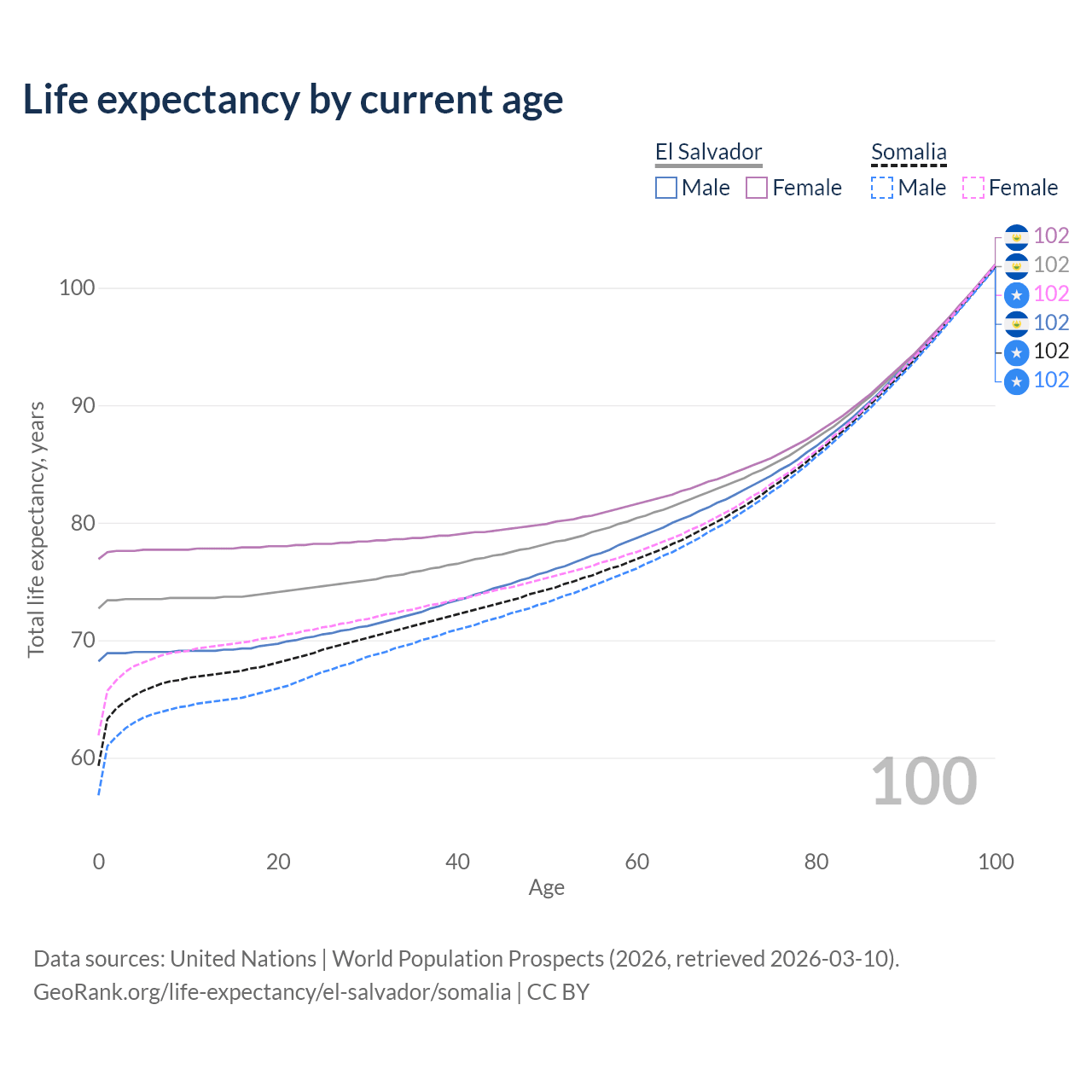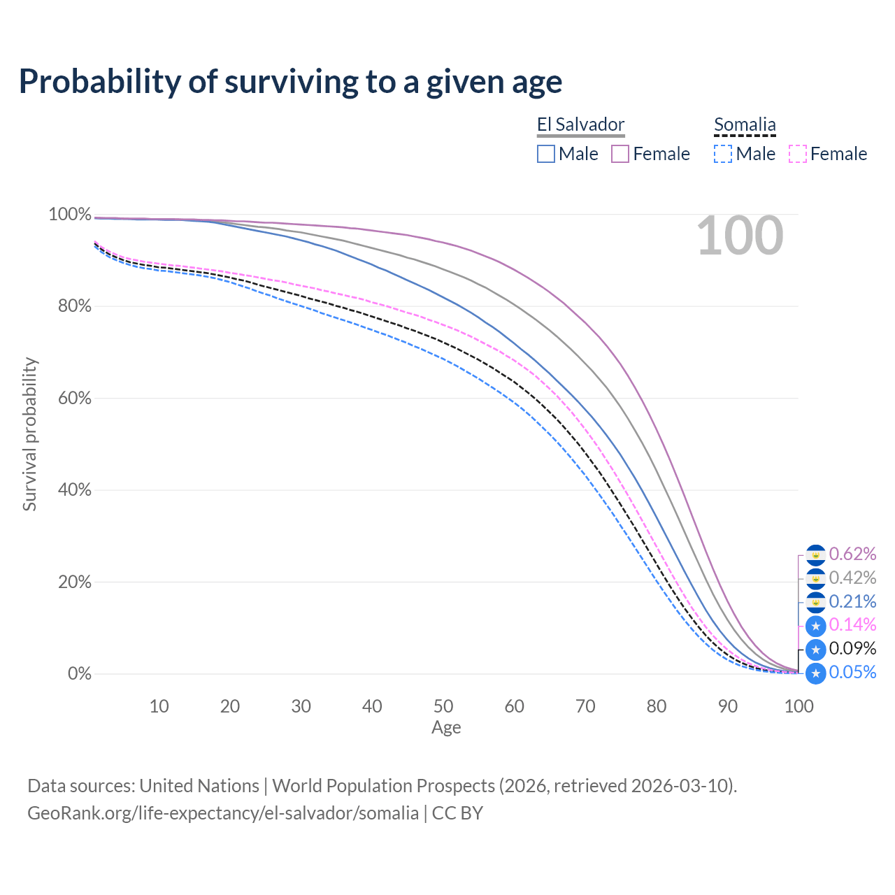 This life expectancy calculator shows the odds of living to 100, 95, 90, and below based on current age for both males and females in El Salvador and Somalia, along with mean and median age of death. The calculations are based on the 2026 life tables (actuarial tables) from the UN World Population Prospects.