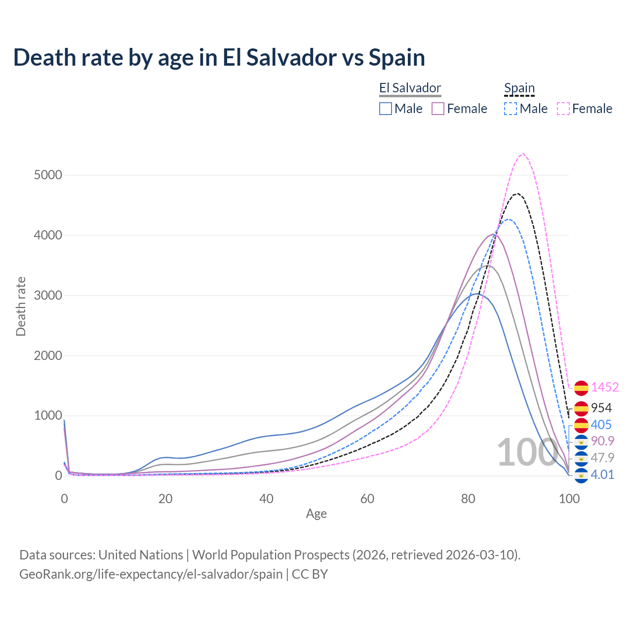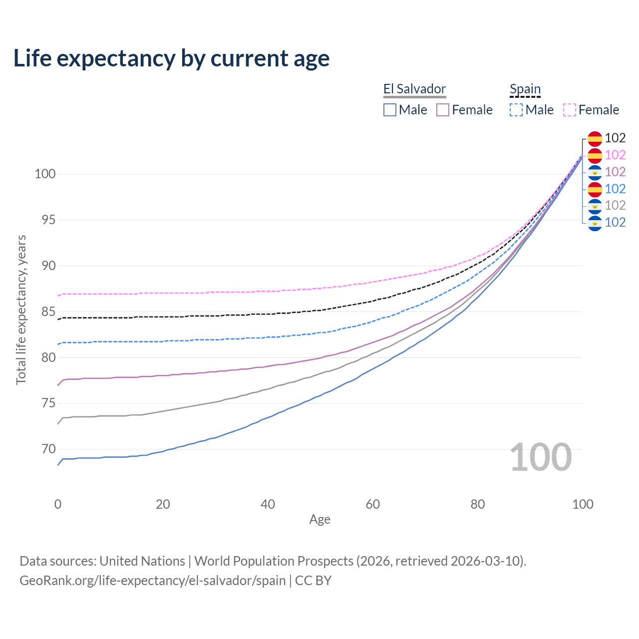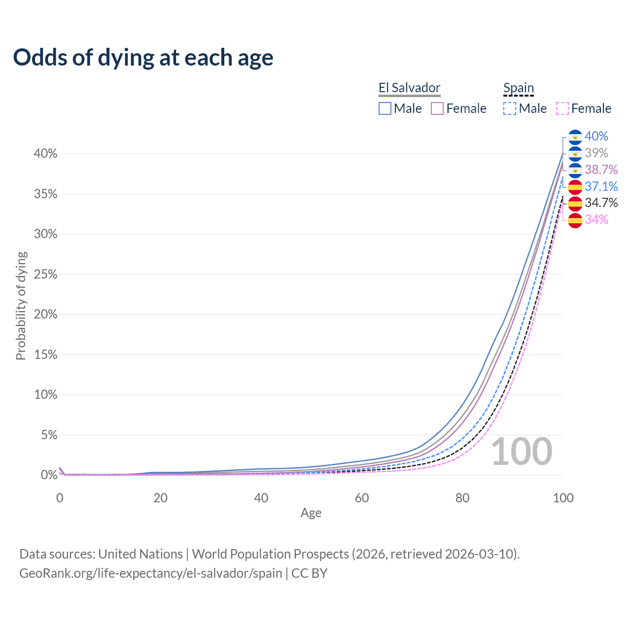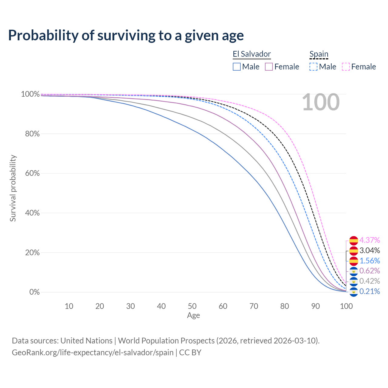 This life expectancy calculator shows the odds of living to 100, 95, 90, and below based on current age for both males and females in El Salvador and Spain, along with mean and median age of death. The calculations are based on the 2026 life tables (actuarial tables) from the UN World Population Prospects.