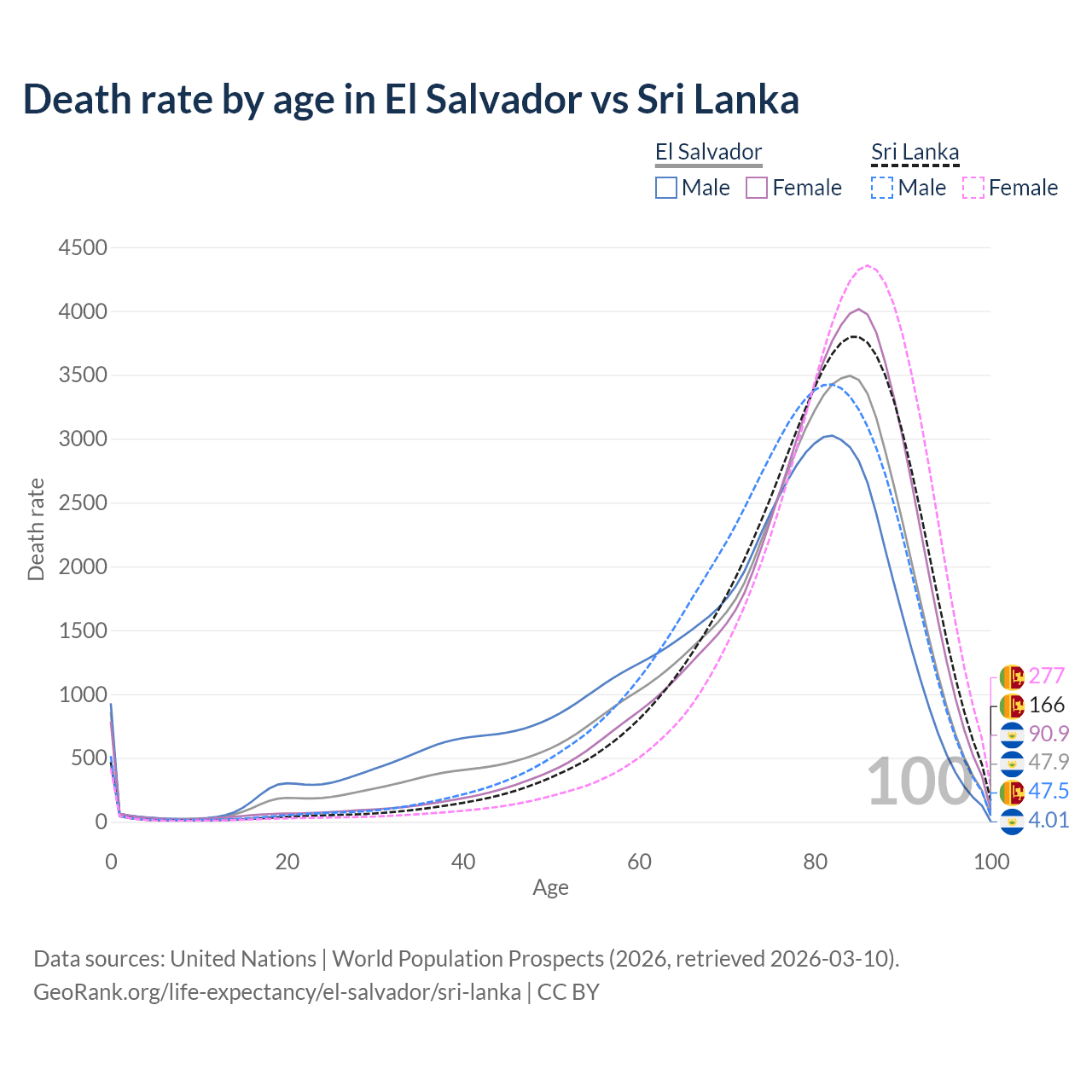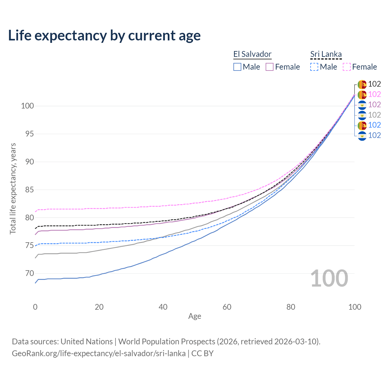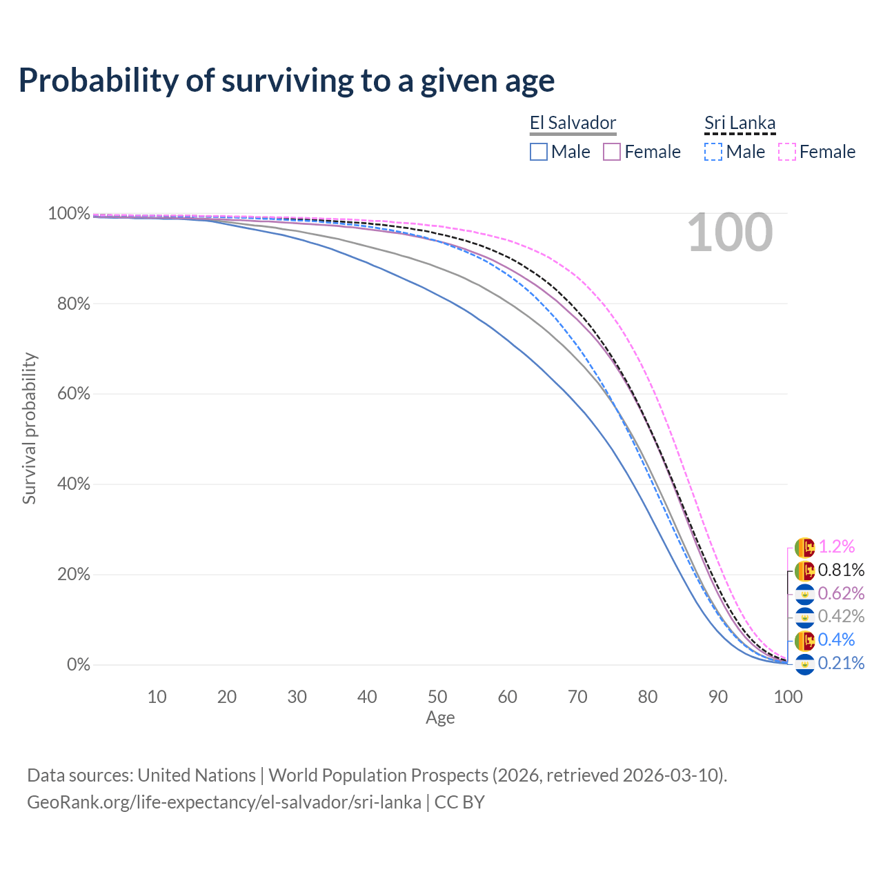 This life expectancy calculator shows the odds of living to 100, 95, 90, and below based on current age for both males and females in El Salvador and Sri Lanka, along with mean and median age of death. The calculations are based on the 2026 life tables (actuarial tables) from the UN World Population Prospects.