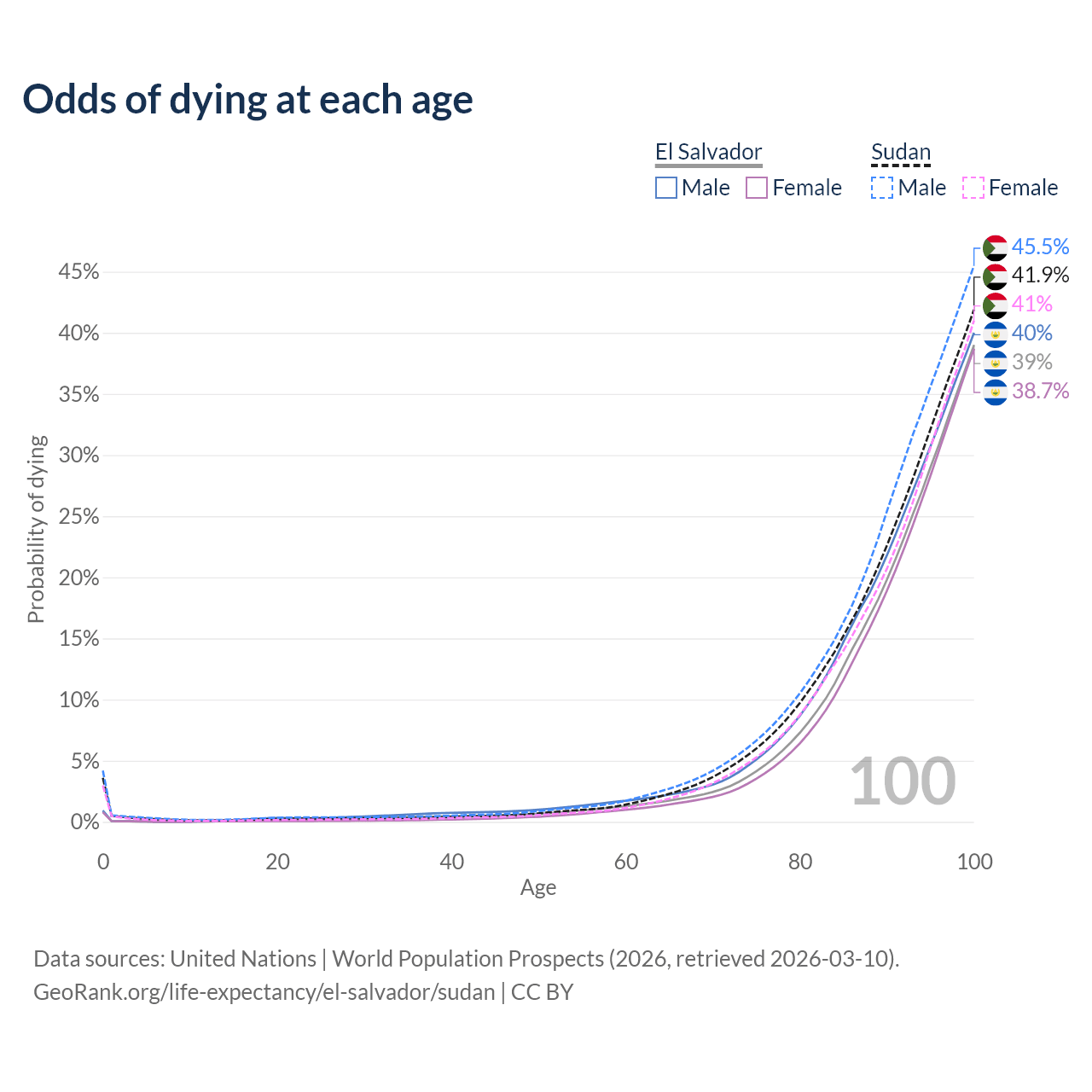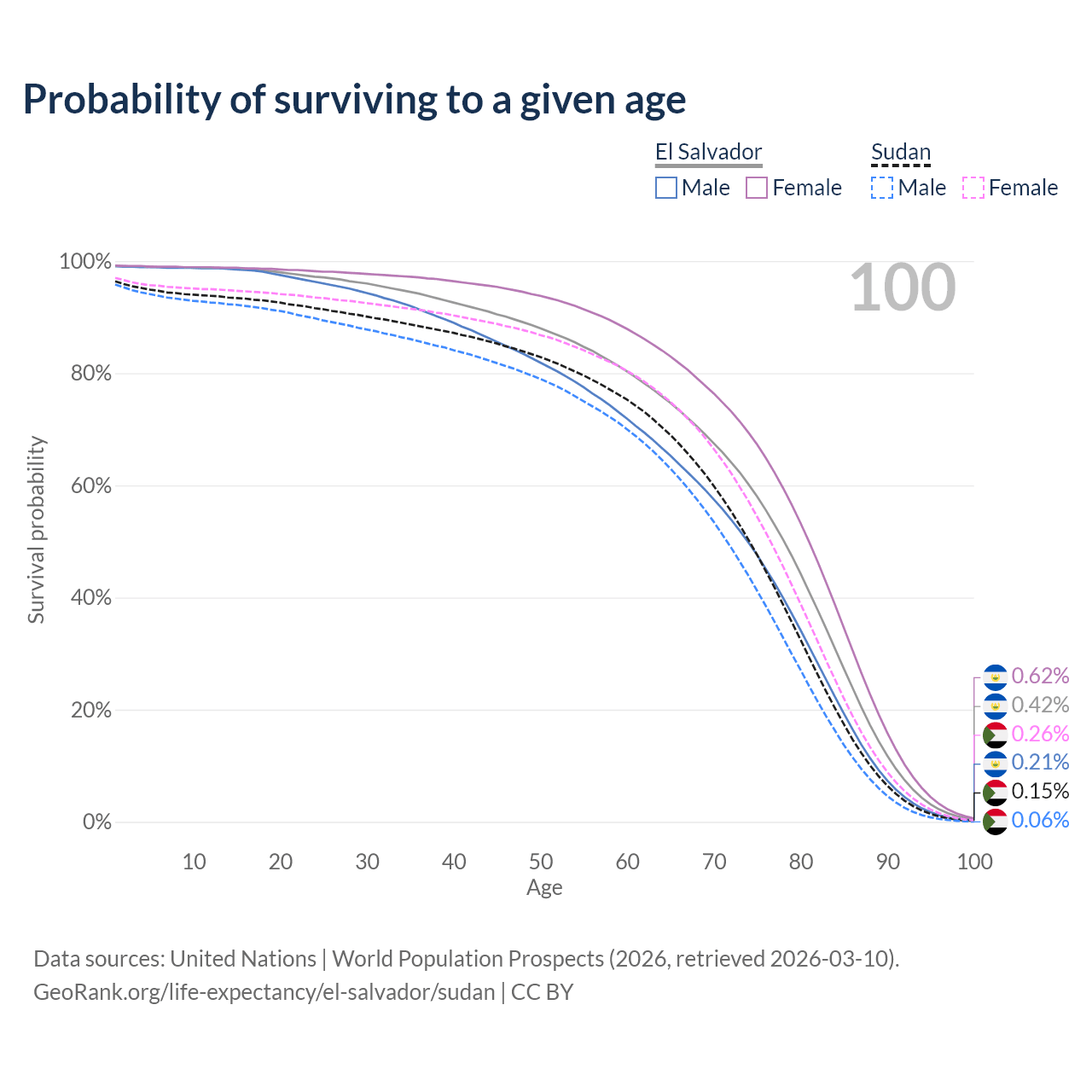 This life expectancy calculator shows the odds of living to 100, 95, 90, and below based on current age for both males and females in El Salvador and Sudan, along with mean and median age of death. The calculations are based on the 2026 life tables (actuarial tables) from the UN World Population Prospects.