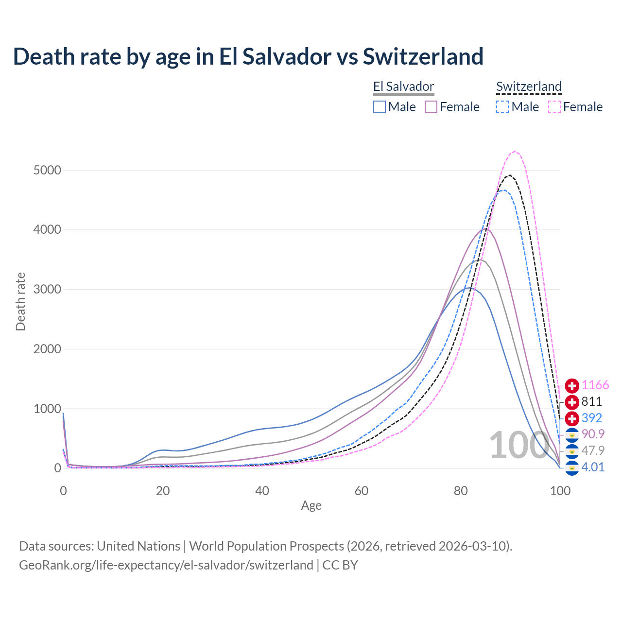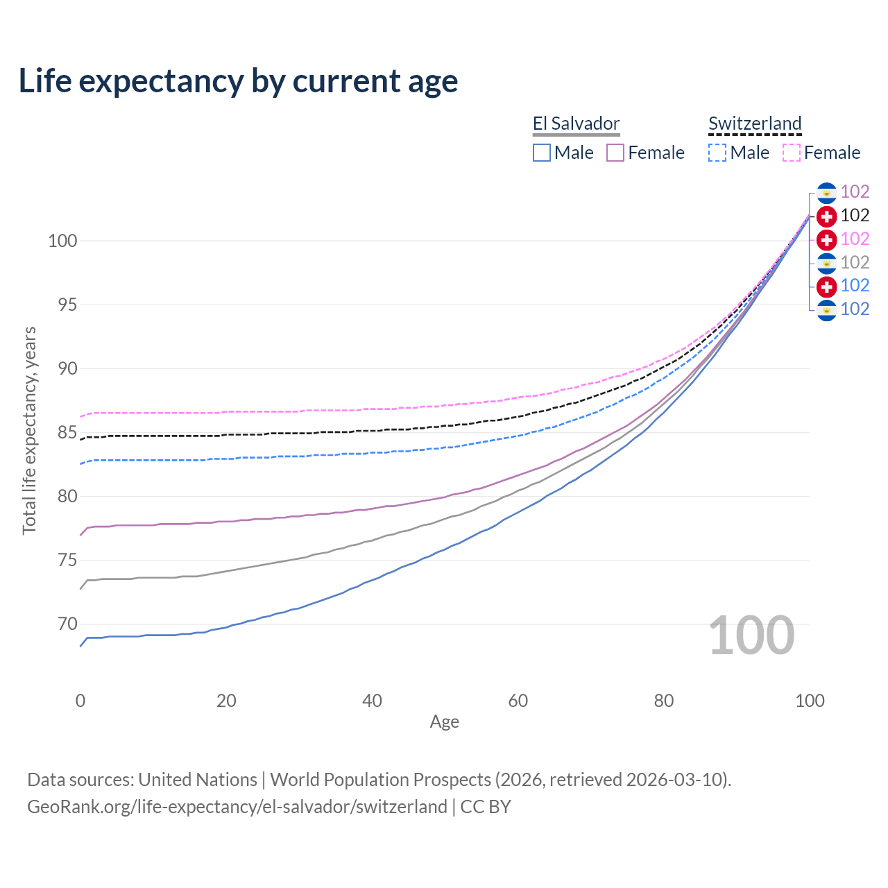 This life expectancy calculator shows the odds of living to 100, 95, 90, and below based on current age for both males and females in El Salvador and Switzerland, along with mean and median age of death. The calculations are based on the 2026 life tables (actuarial tables) from the UN World Population Prospects.