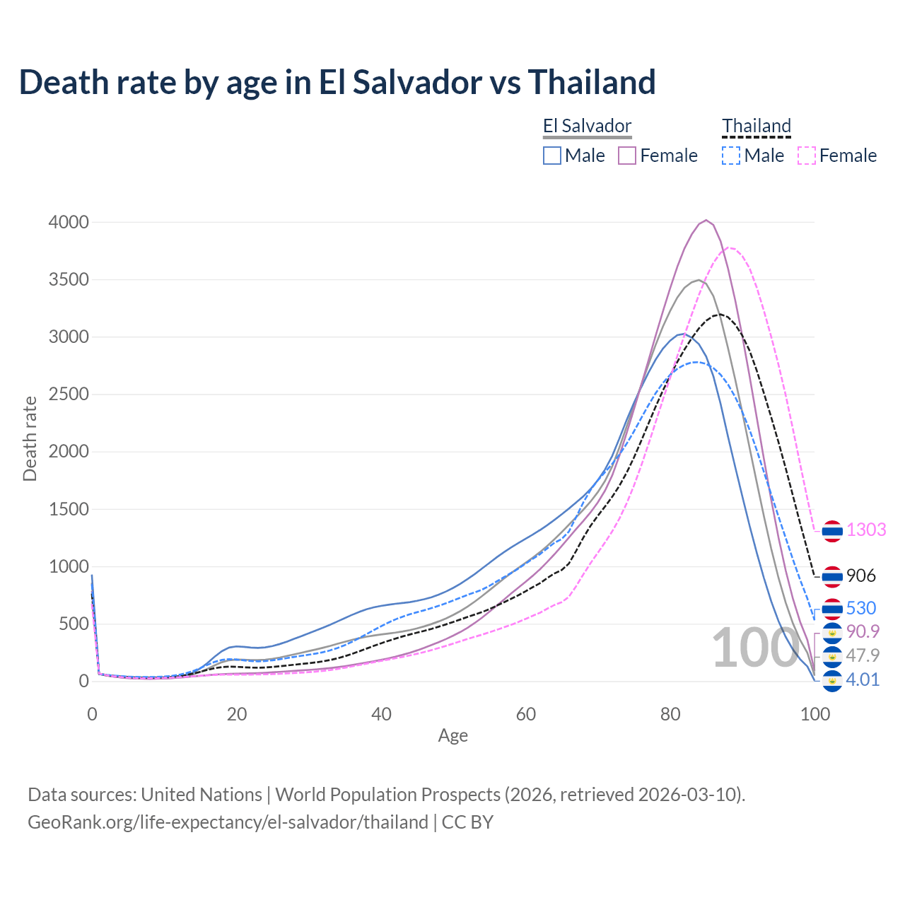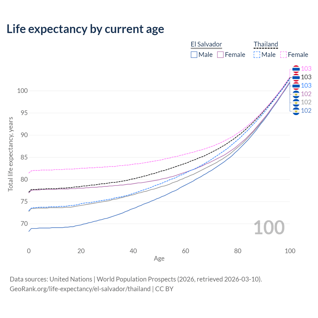 This life expectancy calculator shows the odds of living to 100, 95, 90, and below based on current age for both males and females in El Salvador and Thailand, along with mean and median age of death. The calculations are based on the 2026 life tables (actuarial tables) from the UN World Population Prospects.