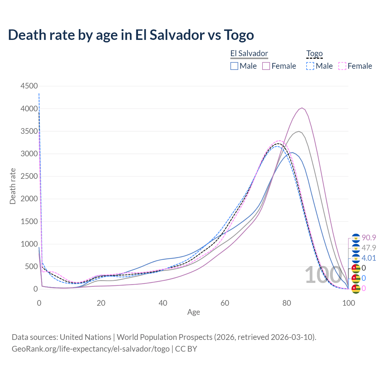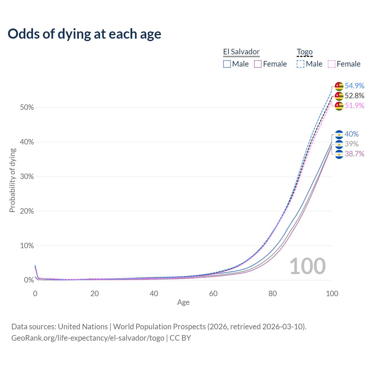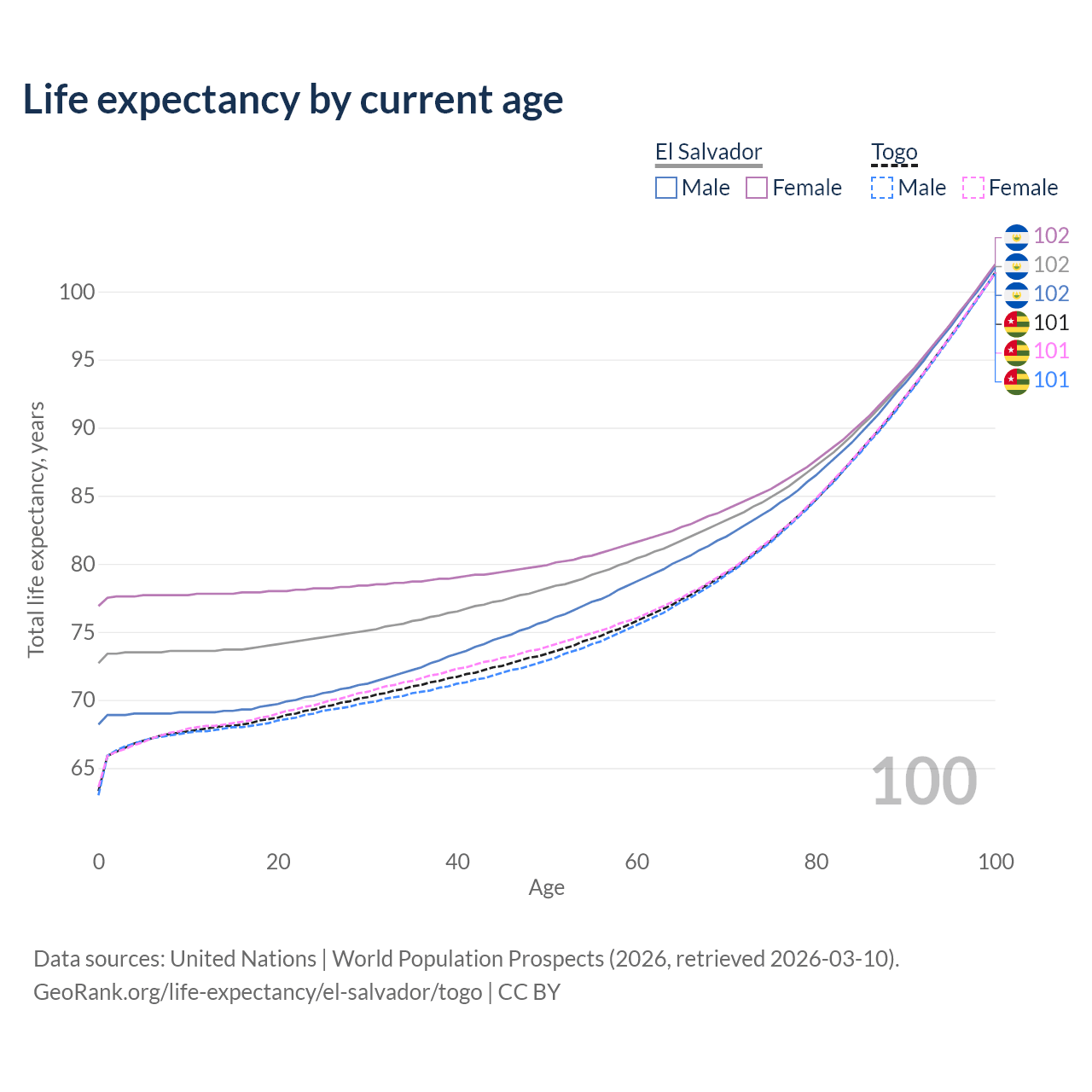 This life expectancy calculator shows the odds of living to 100, 95, 90, and below based on current age for both males and females in El Salvador and Togo, along with mean and median age of death. The calculations are based on the 2026 life tables (actuarial tables) from the UN World Population Prospects.