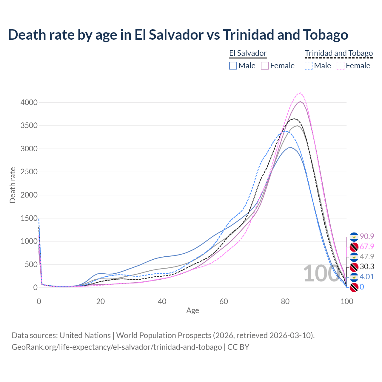 In El Salvador, the most common age of death is 84, compared to 83 in Trinidad and Tobago. The median age of death is 78.1 in El Salvador and 78.4 in Trinidad and Tobago, meaning only half of each cohort is expected to live past that age.