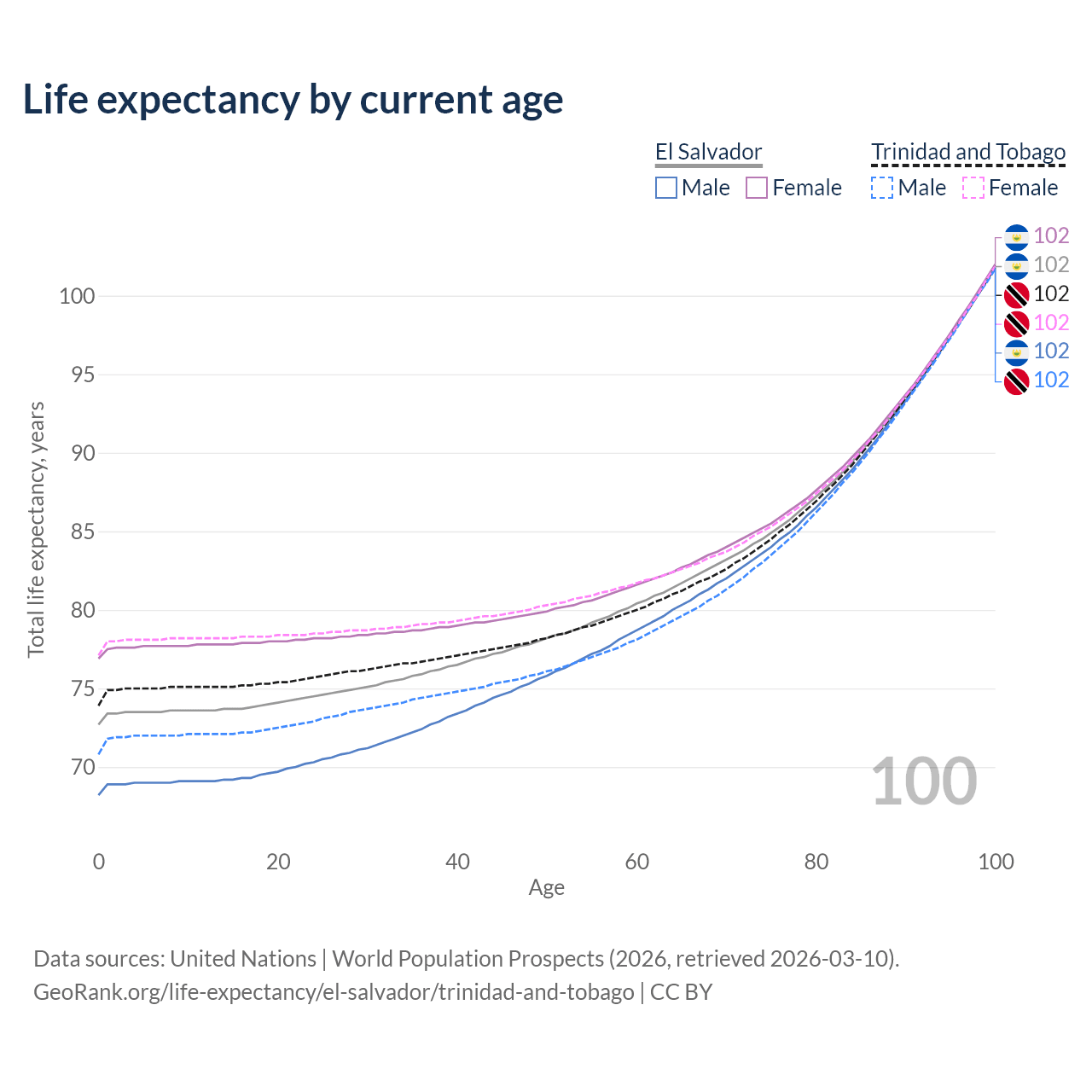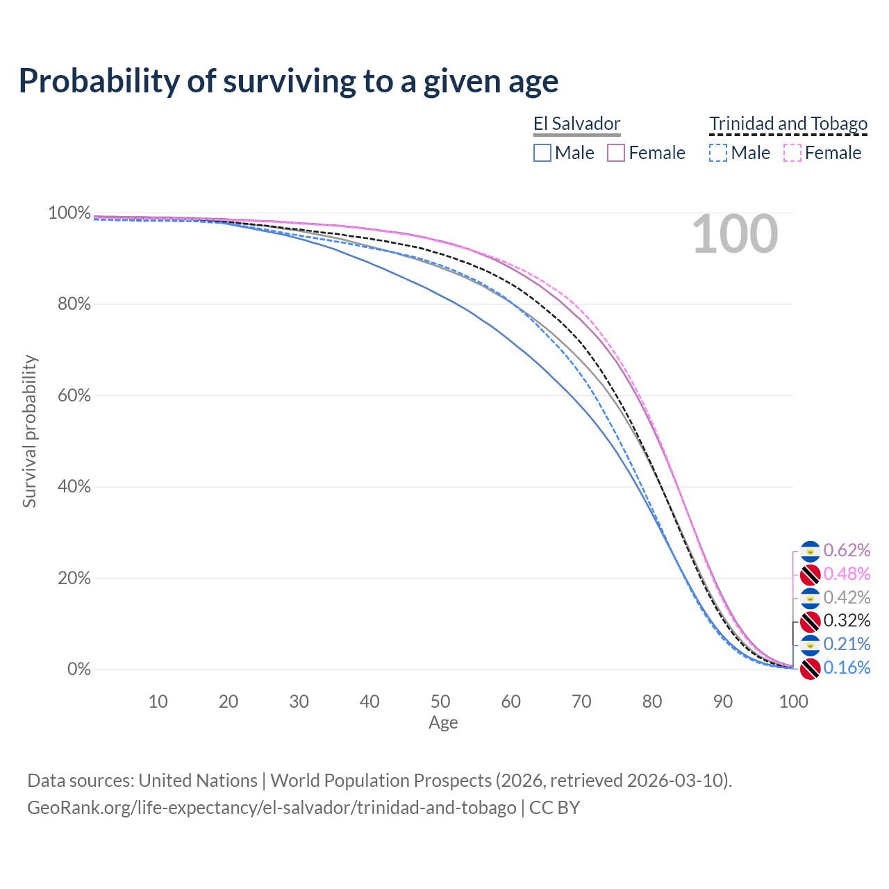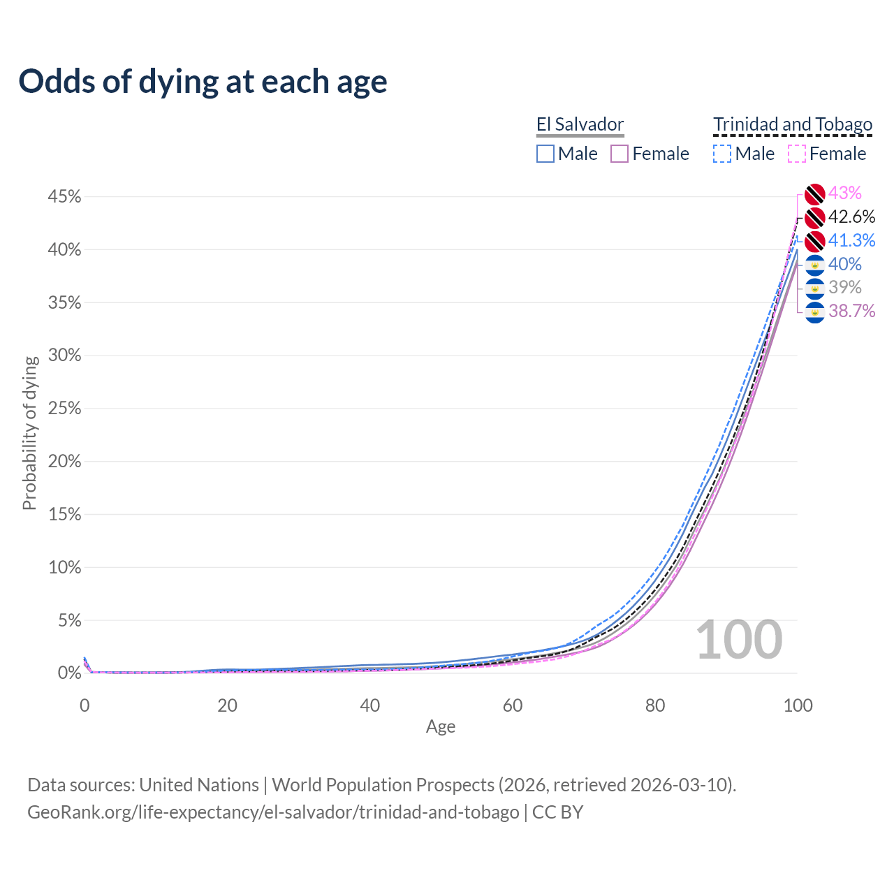 This life expectancy calculator shows the odds of living to 100, 95, 90, and below based on current age for both males and females in El Salvador and Trinidad and Tobago, along with mean and median age of death. The calculations are based on the 2026 life tables (actuarial tables) from the UN World Population Prospects.