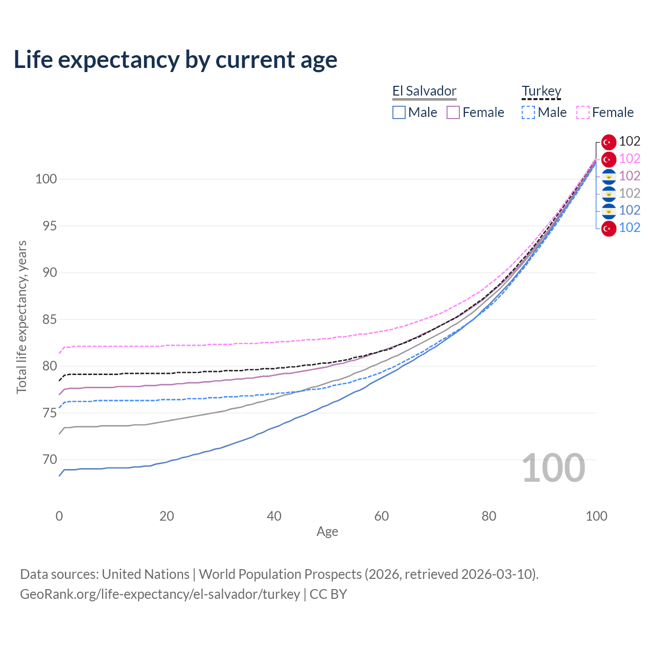 This life expectancy calculator shows the odds of living to 100, 95, 90, and below based on current age for both males and females in El Salvador and Turkey, along with mean and median age of death. The calculations are based on the 2026 life tables (actuarial tables) from the UN World Population Prospects.