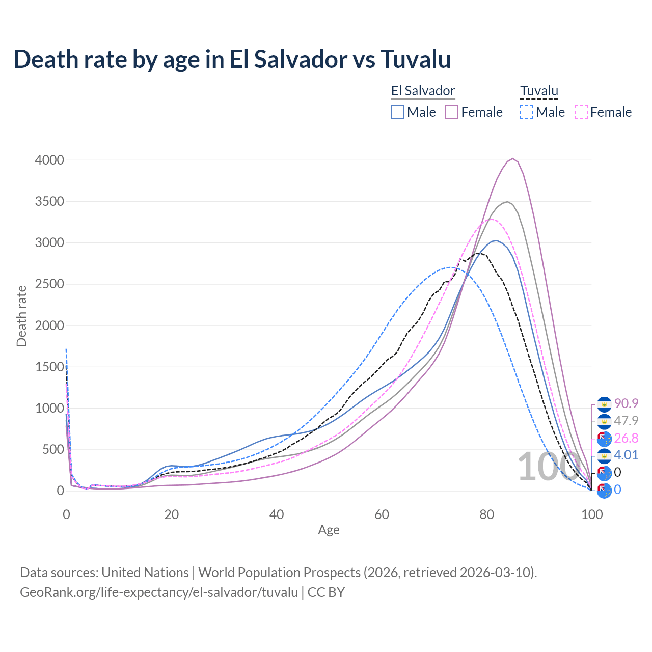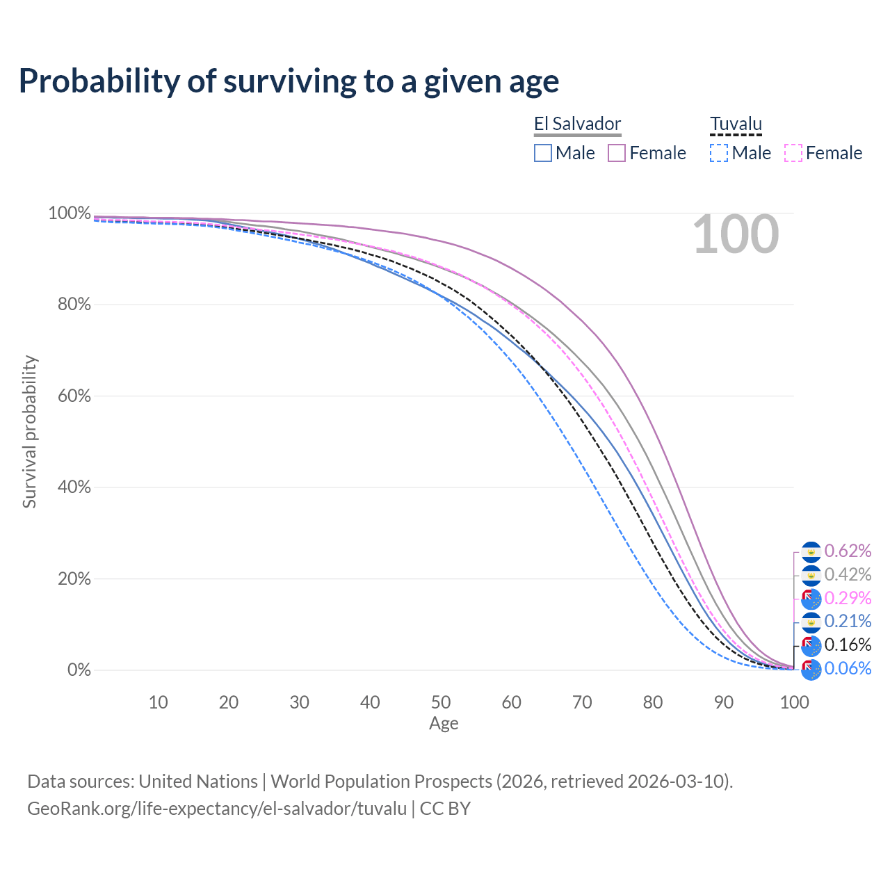 This life expectancy calculator shows the odds of living to 100, 95, 90, and below based on current age for both males and females in El Salvador and Tuvalu, along with mean and median age of death. The calculations are based on the 2026 life tables (actuarial tables) from the UN World Population Prospects.