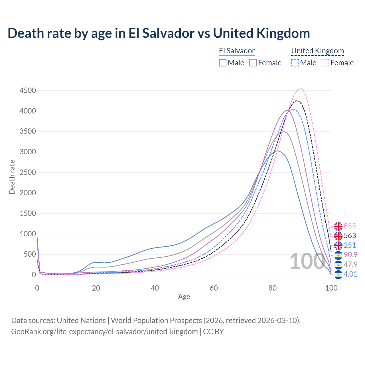 In El Salvador, the most common age of death is 84, compared to 88 in the United Kingdom. The median age of death is 78.1 in El Salvador and 84.9 in the United Kingdom, meaning only half of each cohort is expected to live past that age.