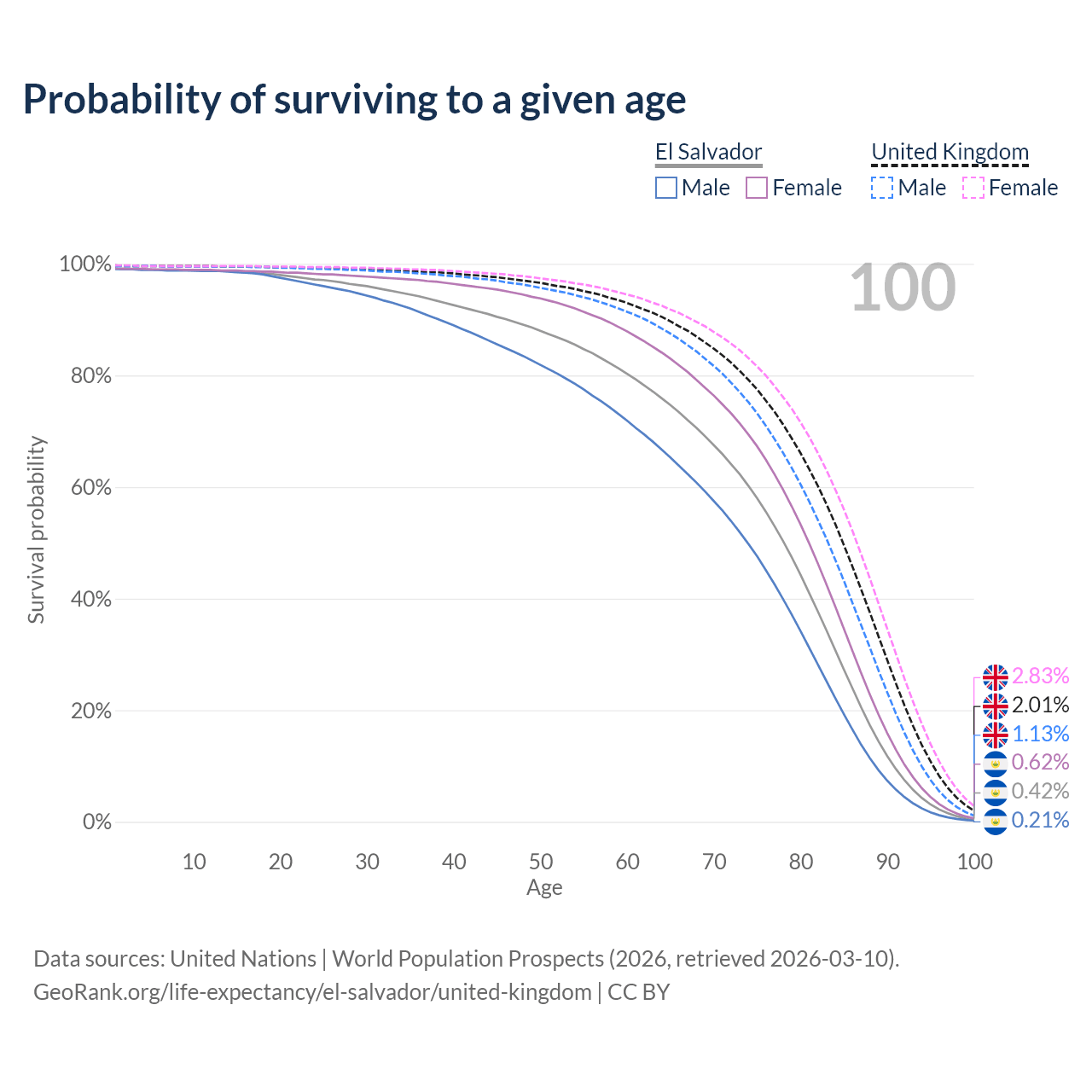 This life expectancy calculator shows the odds of living to 100, 95, 90, and below based on current age for both males and females in El Salvador and the United Kingdom, along with mean and median age of death. The calculations are based on the 2026 life tables (actuarial tables) from the UN World Population Prospects.