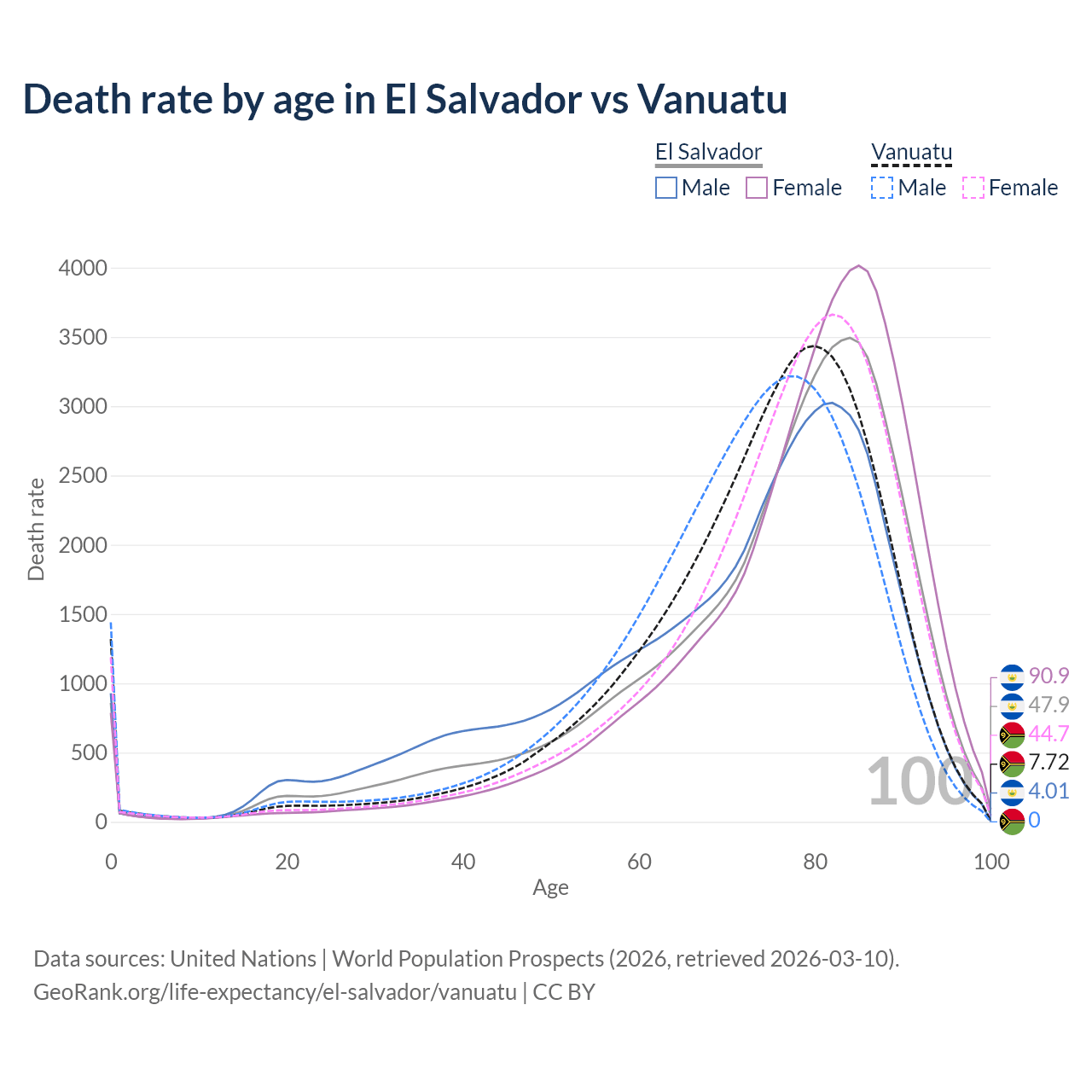In El Salvador, the most common age of death is 84, compared to 80 in Vanuatu. The median age of death is 78.1 in El Salvador and 75.9 in Vanuatu, meaning only half of each cohort is expected to live past that age.