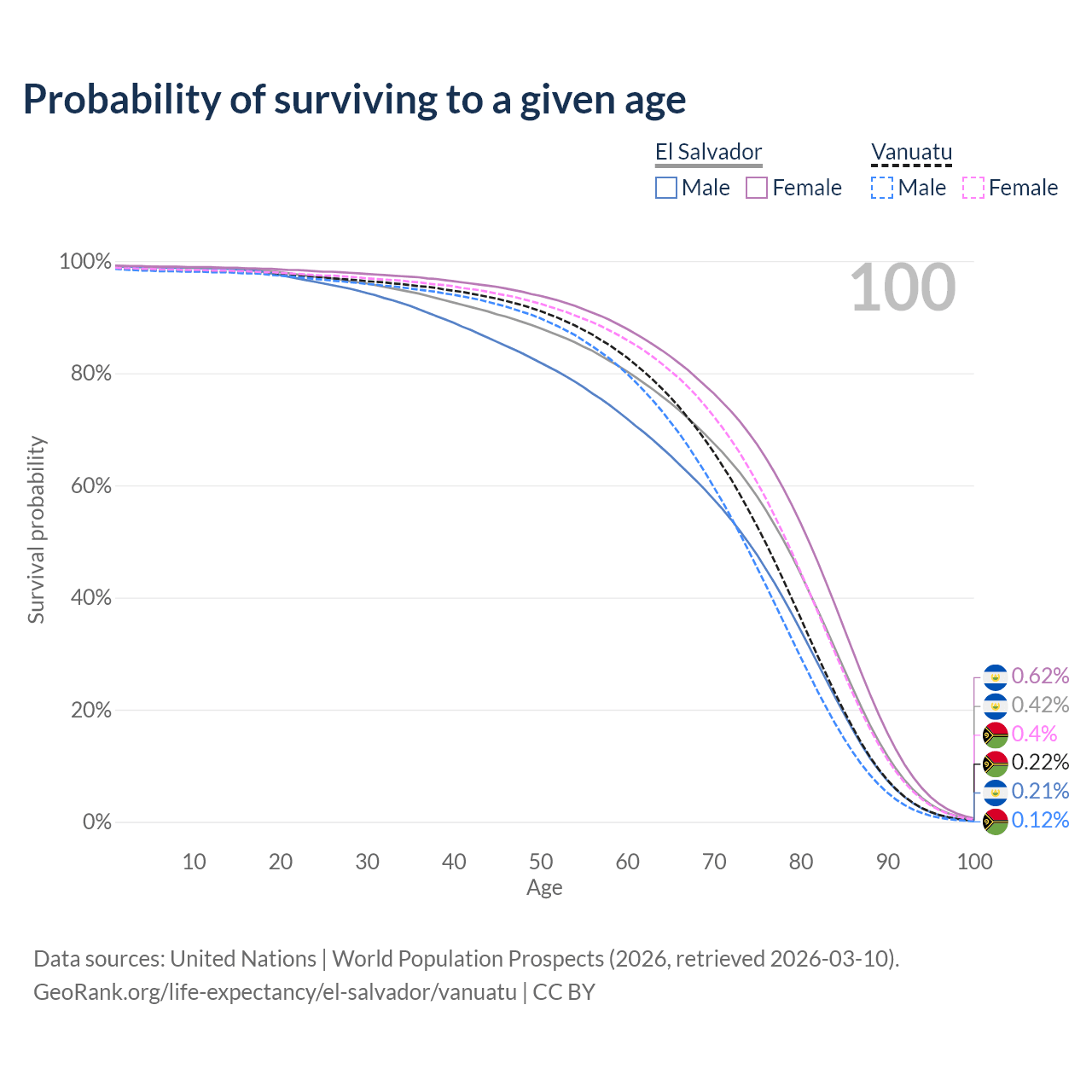 This life expectancy calculator shows the odds of living to 100, 95, 90, and below based on current age for both males and females in El Salvador and Vanuatu, along with mean and median age of death. The calculations are based on the 2026 life tables (actuarial tables) from the UN World Population Prospects.
