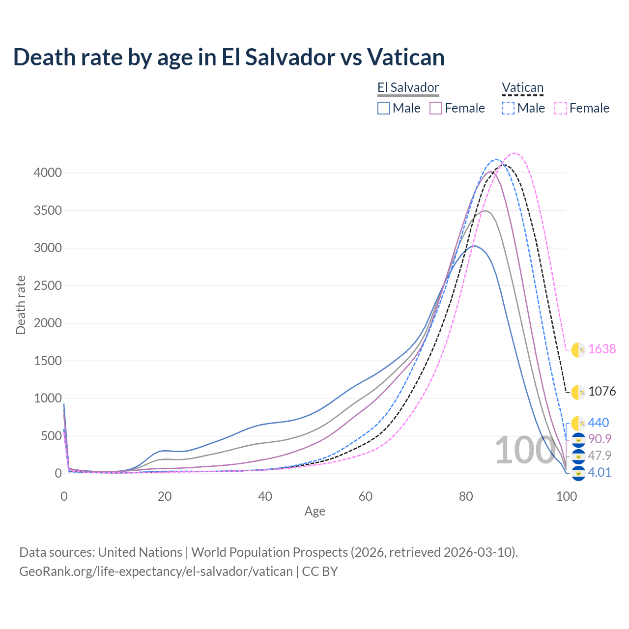 This life expectancy calculator shows the odds of living to 100, 95, 90, and below based on current age for both males and females in El Salvador and the Vatican, along with mean and median age of death. The calculations are based on the 2026 life tables (actuarial tables) from the UN World Population Prospects.