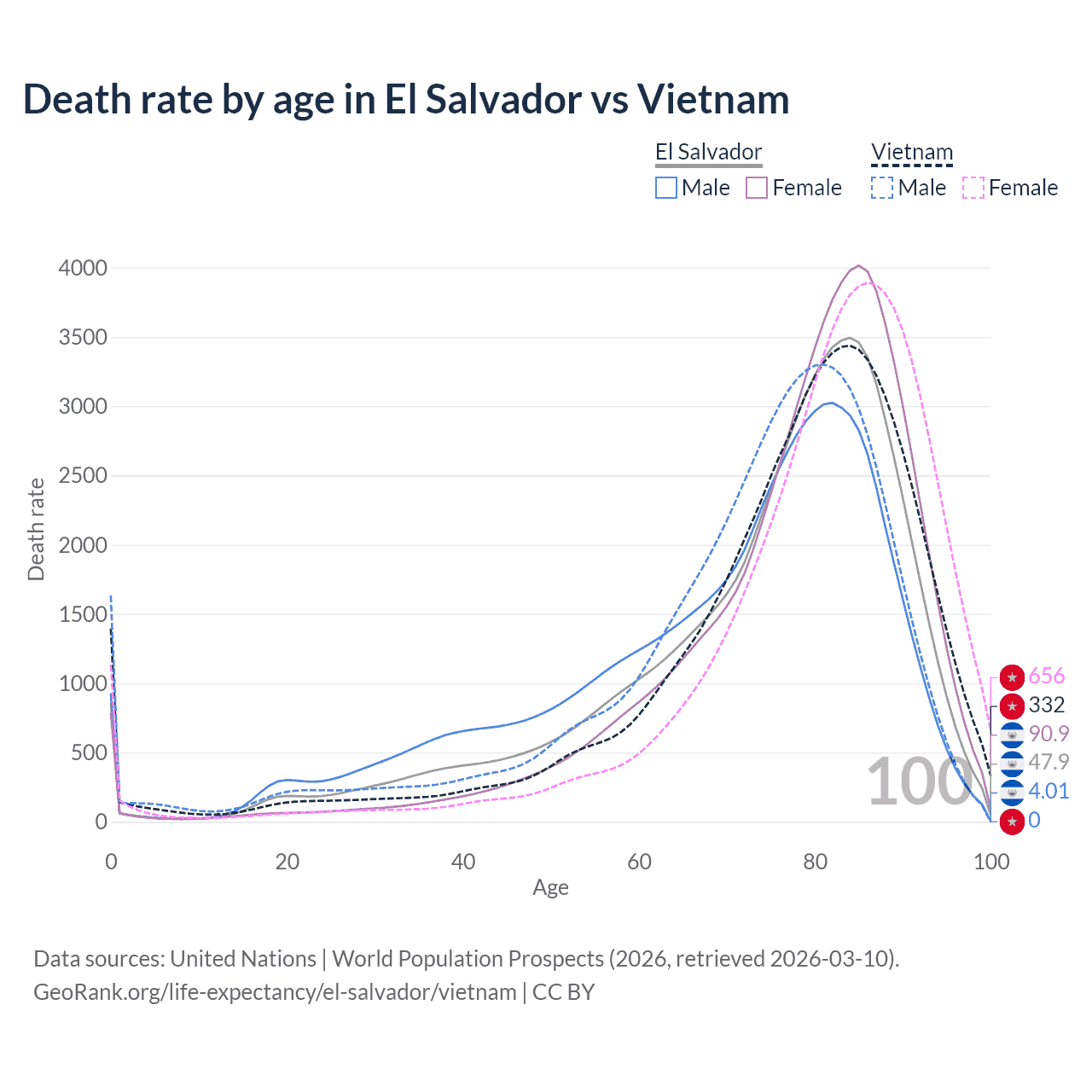 In El Salvador, the most common age of death is 84, compared to 84 in Vietnam. The median age of death is 78.1 in El Salvador and 79.9 in Vietnam, meaning only half of each cohort is expected to live past that age.