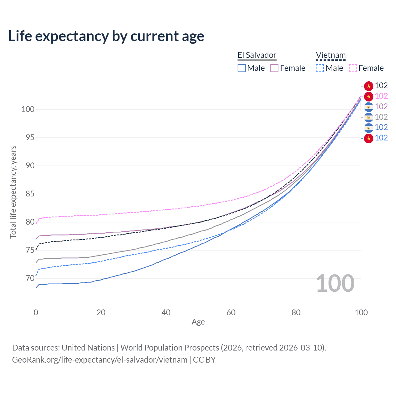 This life expectancy calculator shows the odds of living to 100, 95, 90, and below based on current age for both males and females in El Salvador and Vietnam, along with mean and median age of death. The calculations are based on the 2026 life tables (actuarial tables) from the UN World Population Prospects.