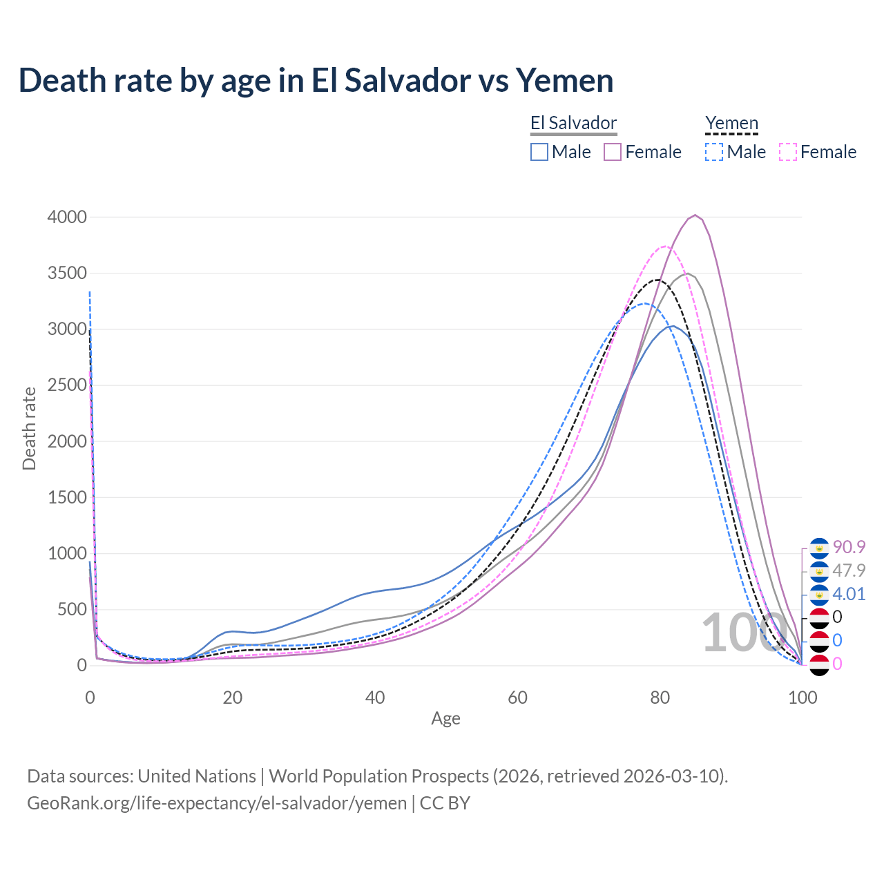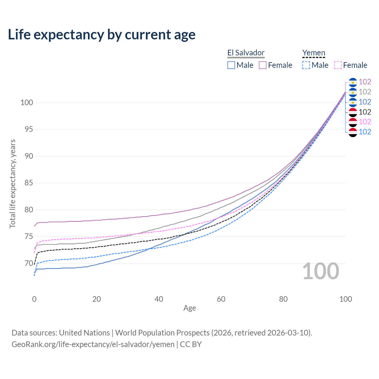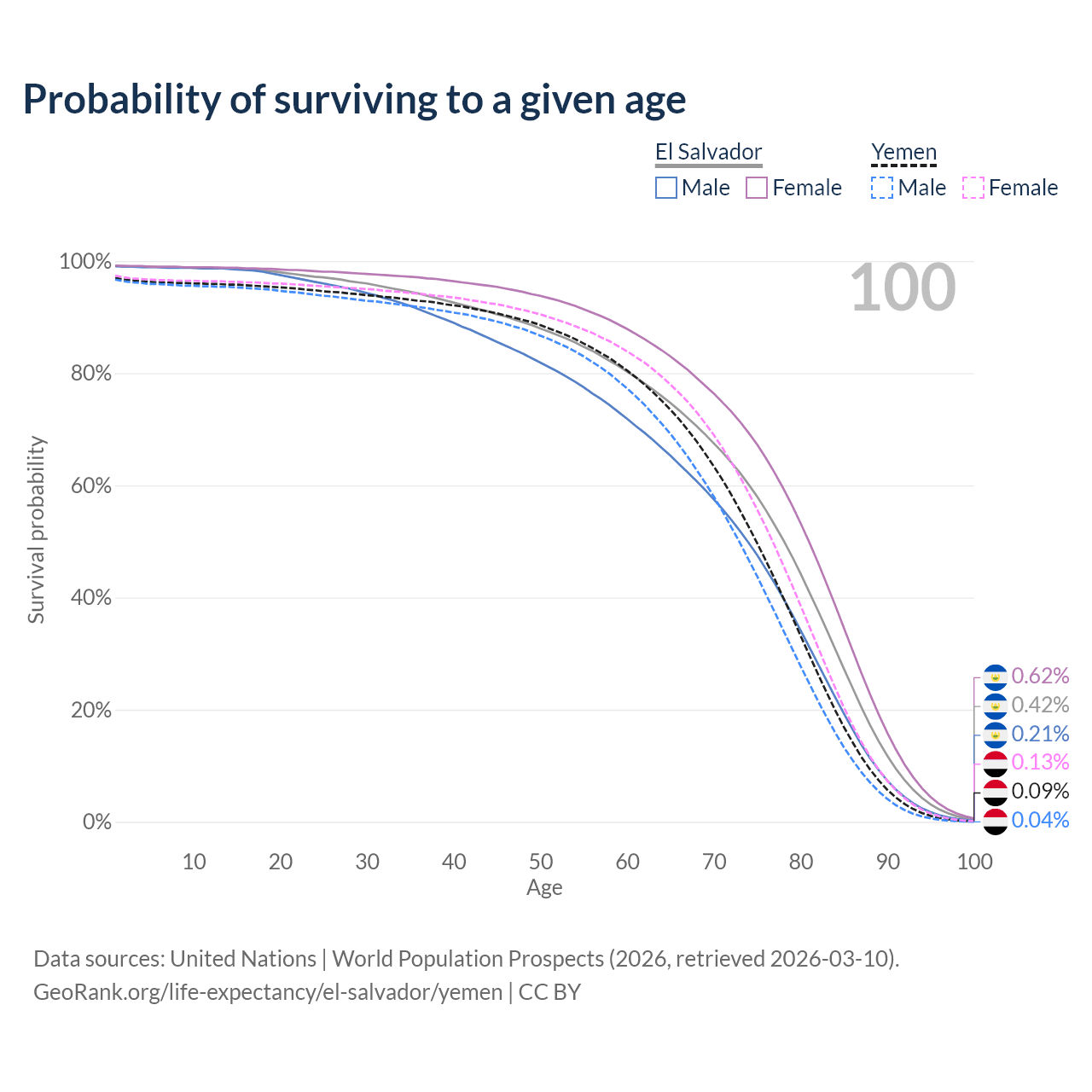 This life expectancy calculator shows the odds of living to 100, 95, 90, and below based on current age for both males and females in El Salvador and Yemen, along with mean and median age of death. The calculations are based on the 2026 life tables (actuarial tables) from the UN World Population Prospects.