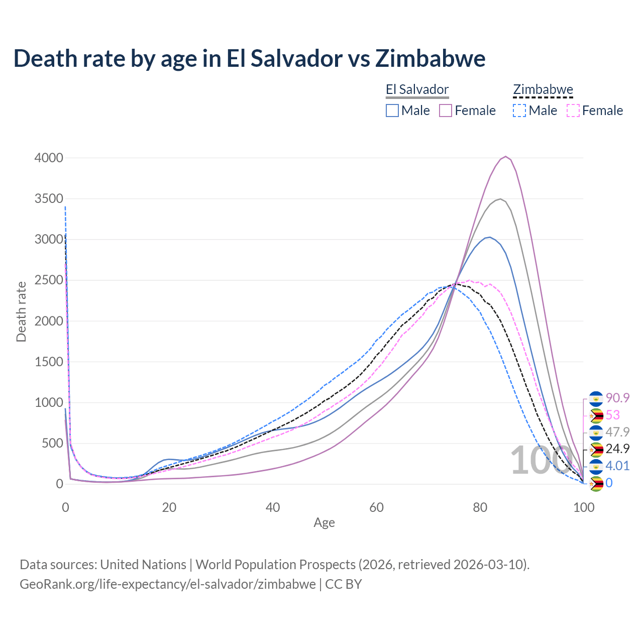 In El Salvador, the most common age of death is 84, compared to 0 in Zimbabwe. The median age of death is 78.1 in El Salvador and 68.8 in Zimbabwe, meaning only half of each cohort is expected to live past that age.