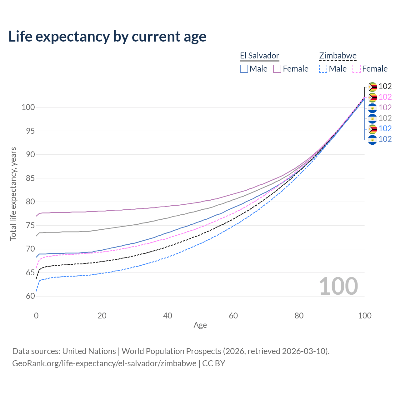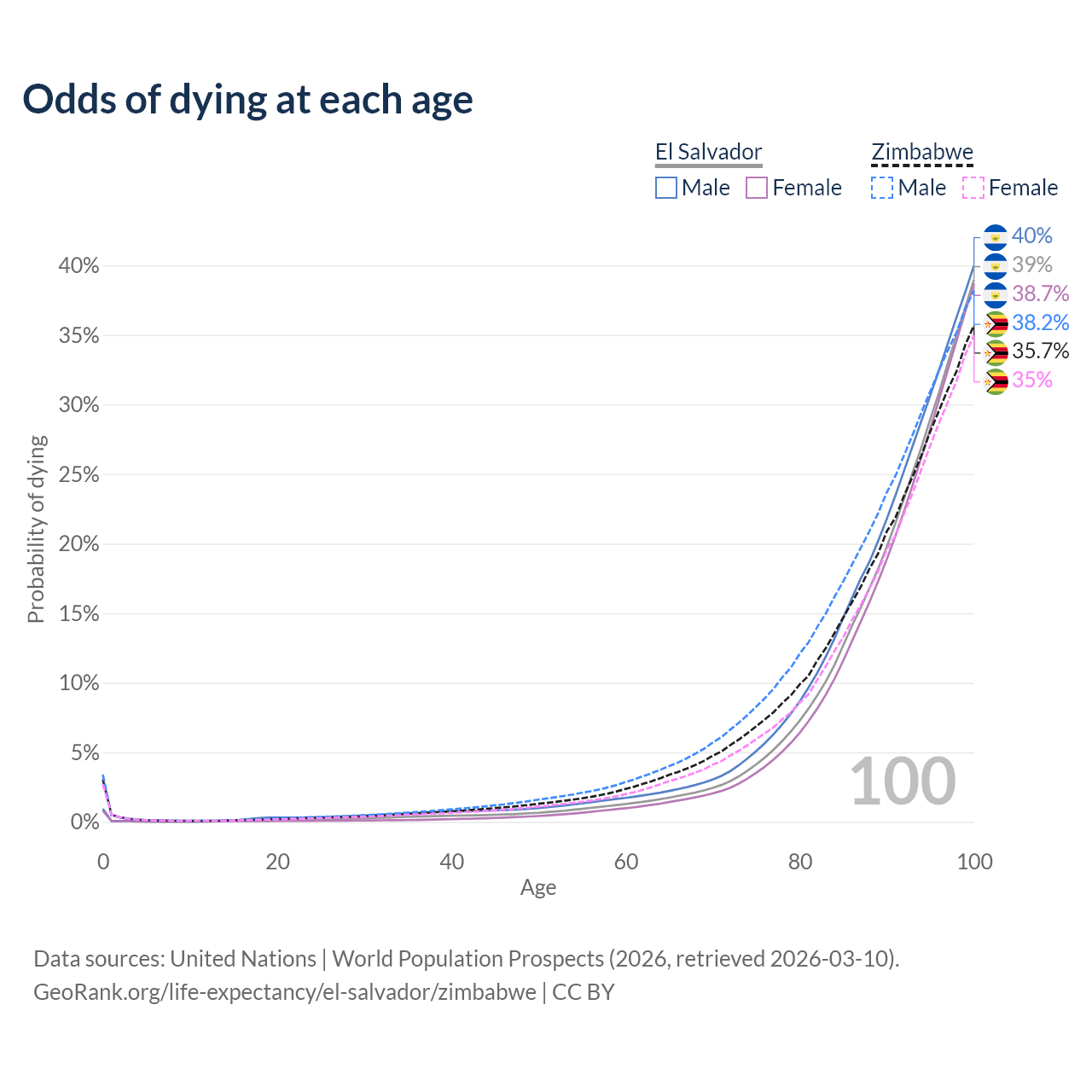 This life expectancy calculator shows the odds of living to 100, 95, 90, and below based on current age for both males and females in El Salvador and Zimbabwe, along with mean and median age of death. The calculations are based on the 2026 life tables (actuarial tables) from the UN World Population Prospects.