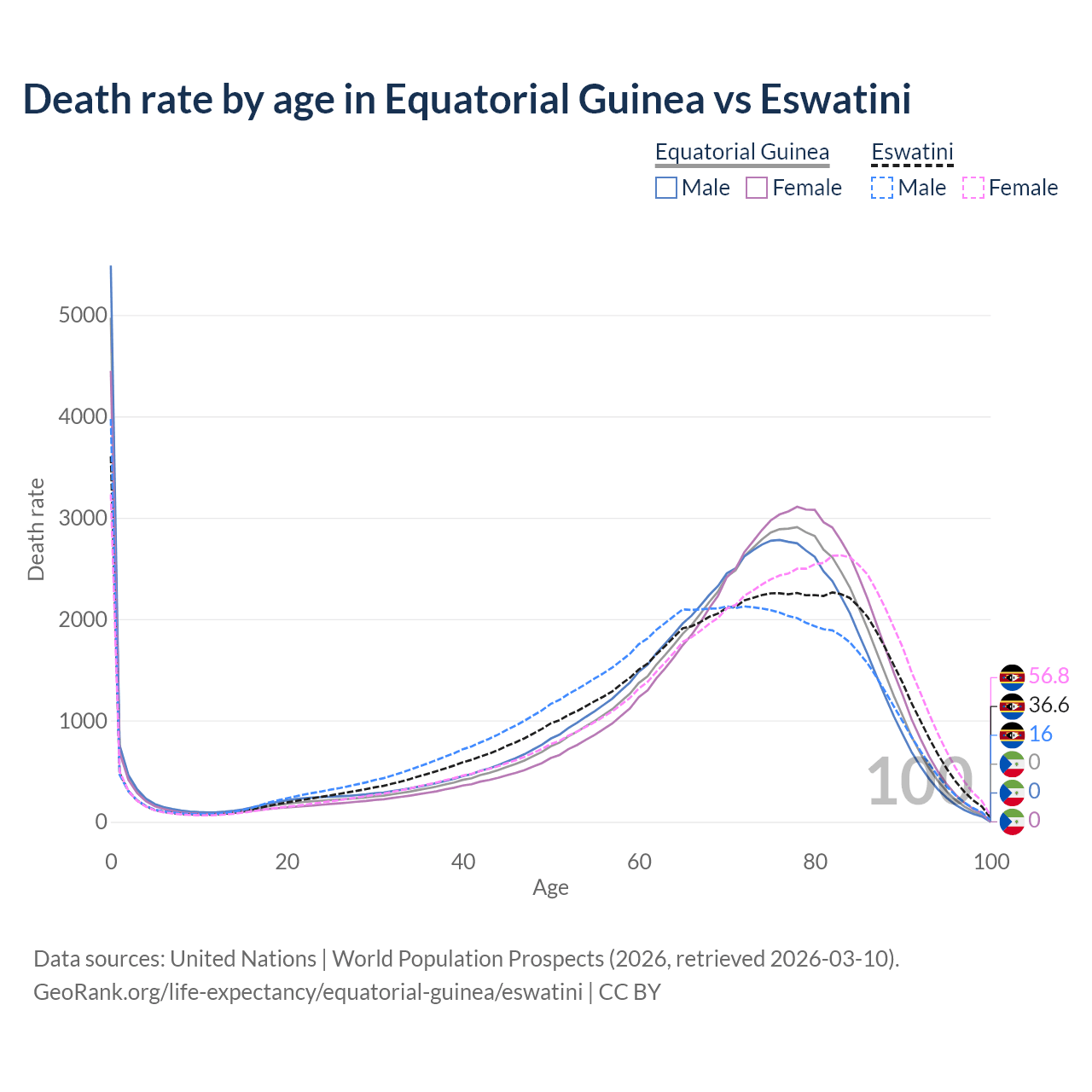 In Equatorial Guinea, the most common age of death is 0, compared to 0 in Eswatini. The median age of death is 71.3 in Equatorial Guinea and 69.7 in Eswatini, meaning only half of each cohort is expected to live past that age.