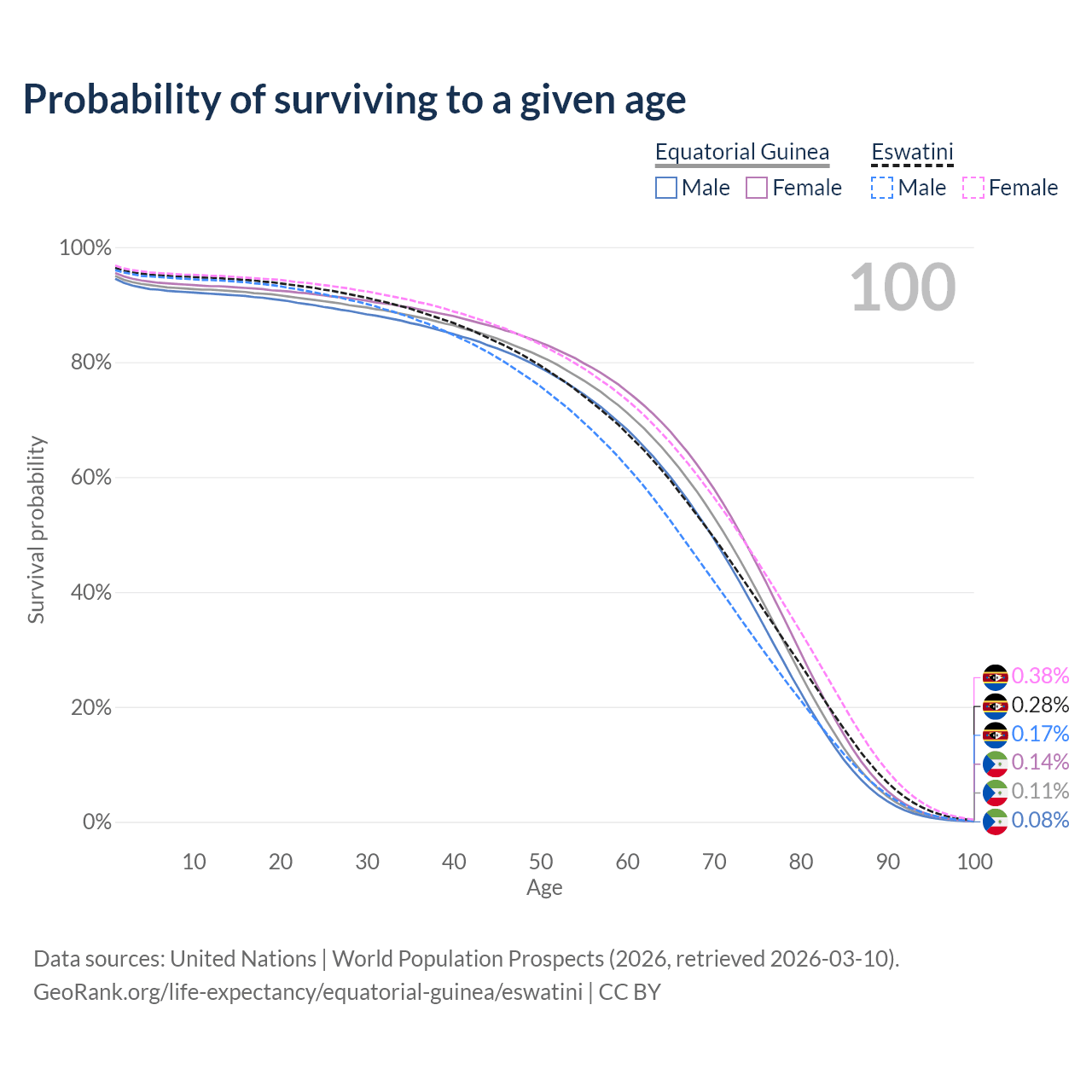 This life expectancy calculator shows the odds of living to 100, 95, 90, and below based on current age for both males and females in Equatorial Guinea and Eswatini, along with mean and median age of death. The calculations are based on the 2026 life tables (actuarial tables) from the UN World Population Prospects.